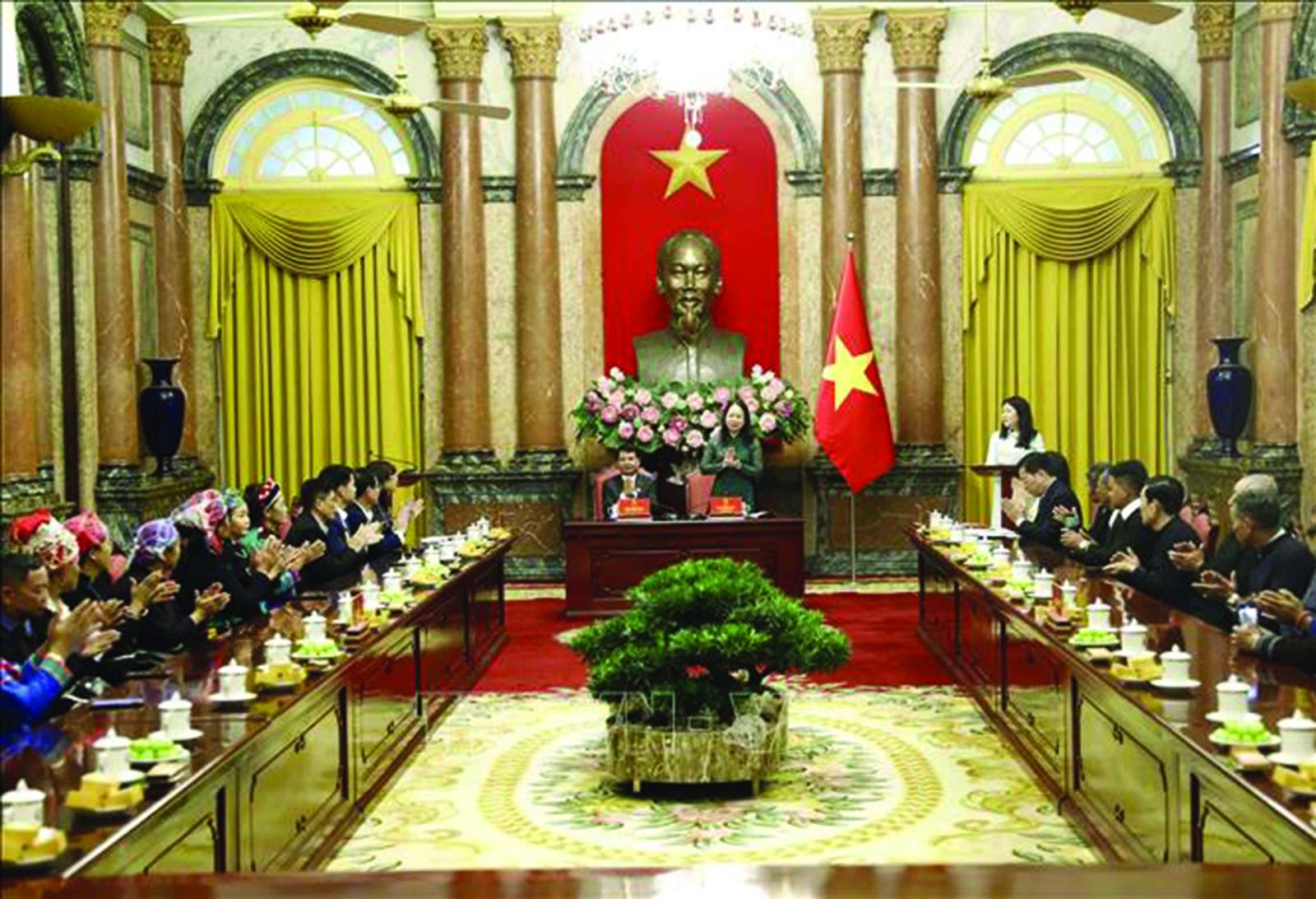 Bày tỏ xúc động khi gặp mặt 21 đại biểu - đại diện cho 1.121 người có uy tín trong đồng bào dân tộc thiểu số của tỉnh Lào Cai, Phó Chủ tịch nước Võ Thị Ánh Xuân khẳng định, Đảng, Nhà nước luôn dành sự quan tâm đặc biệt cho đồng bào dân tộc thiểu số trên cả nước, đề cao vị trí của công tác dân tộc cũng như cơ chế, chính sách hỗ trợ, phát huy vai trò của đồng bào dân tộc thiểu số. Đến nay, đời sống vật chất, tinh thần của đồng bào dân tộc thiểu số ngày càng được nâng lên, rút ngắn khoảng cách phát triển; tạo sự đoàn kết, cùng chung tay xây dựng, phát triển đất nước.