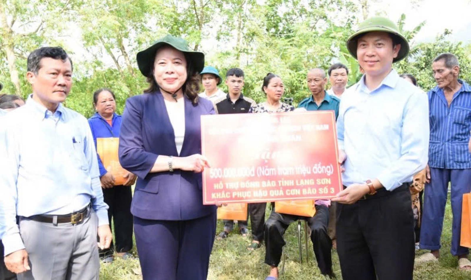 Phó Chủ tịch nước Võ Thị Ánh Xuân trao biểu trưng số tiền 500 triệu đồng hỗ trợ tỉnh Lạng Sơn khắc phục hậu quả của cơn bão số 3. Ảnh: Đình Quang