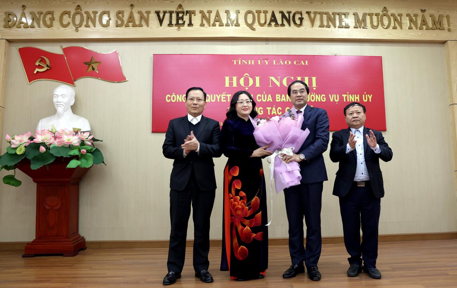 Thường trực Tỉnh ủy Lào Cai trao quyết định và tặng hoa chức mừng đối với bà Giàng Thị Dung, tân Bí thư Thành ủy Lào Cai. Ảnh: ND