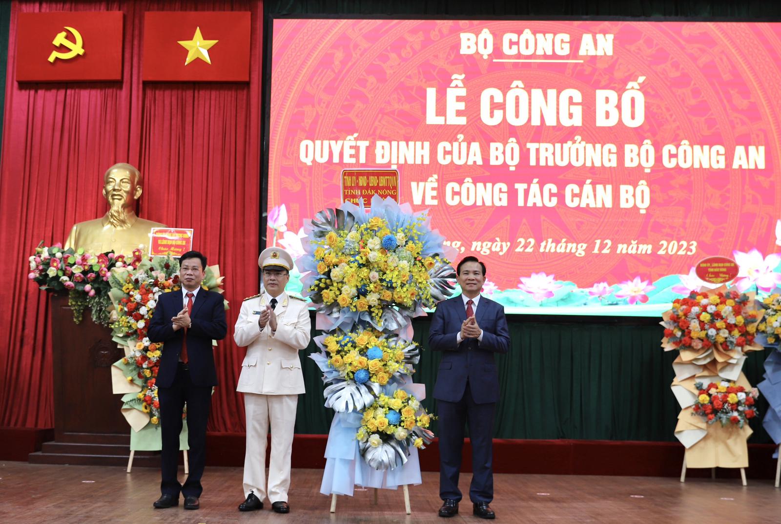 Lãnh đạo Tỉnh ủy, HĐND, UBND tỉnh Đắk Nông tặng hoa chúc mừng tân Giám đốc Công an tỉnh Đắk Nông. Ảnh: Công an cung cấp