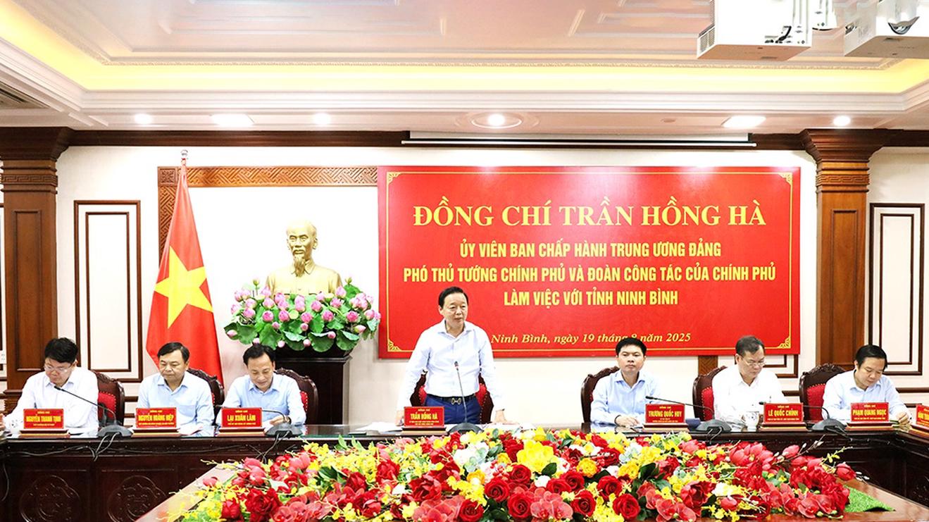 (Thanh tra) - Ngày 19/8, Phó Thủ tướng Chính phủ Trần Hồng Hà cùng Đoàn công tác Chính phủ đã có buổi làm việc với tỉnh Ninh Bình. Tại buổi làm việc, nhiều định hướng chiến lược được gợi mở, từ quy hoạch phát triển bền vững, hạ tầng giao thông, đến những dự án lớn như cảng nước sâu, sân bay quốc tế và tuyến đường sắt đô thị kết nối Hà Nội – Ninh Bình.