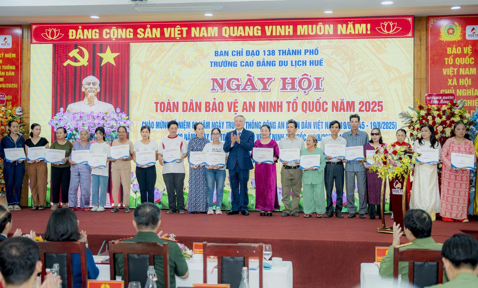 Bên cạnh đó, các đồng chí lãnh đạo Trung ương, TP và nhà trường đã trao tổng cộng 70 suất quà, trong đó: 20 suất quà của Trung ương dành tặng các hộ gia đình có hoàn cảnh khó khăn; 10 suất cho lực lượng tham gia bảo vệ an ninh trật tự ở cơ sở có thành tích nổi bật; 10 suất cho cán bộ, nhân viên nhà trường có hoàn cảnh khó khăn, tích cực trong phong trào; 10 suất cho đại diện các tổ bảo vệ an ninh trật tự ở cơ sở; 20 suất cho học sinh, sinh viên nghèo vượt khó của Trường Cao đẳng Du lịch Huế.