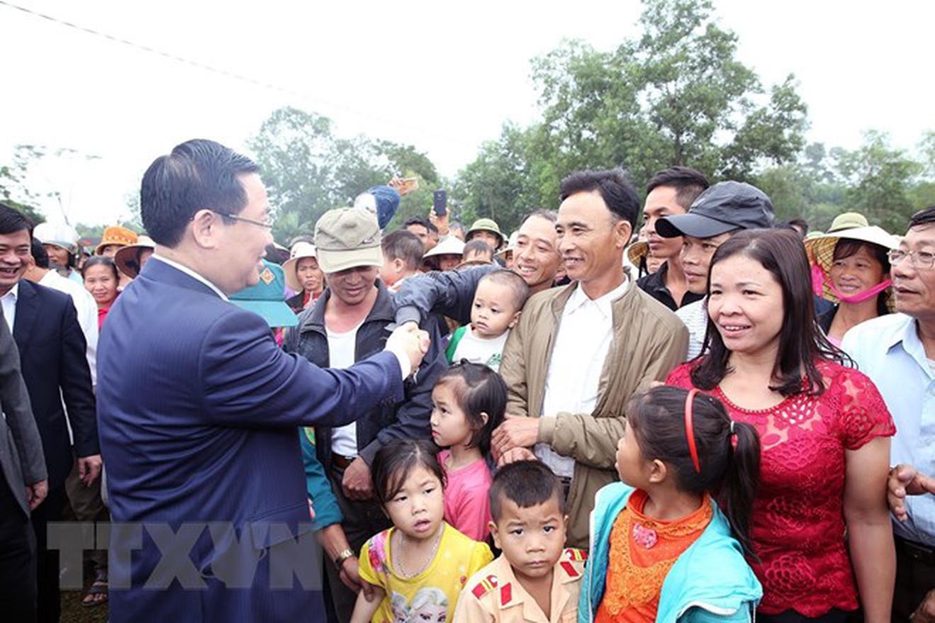 Phó Thủ tướng Vương Đình Huệ thăm hỏi nhân dân xã Hiến Sơn, huyện Đô Lương, Nghệ An. (Ảnh: Bích Huệ/TTXVN)