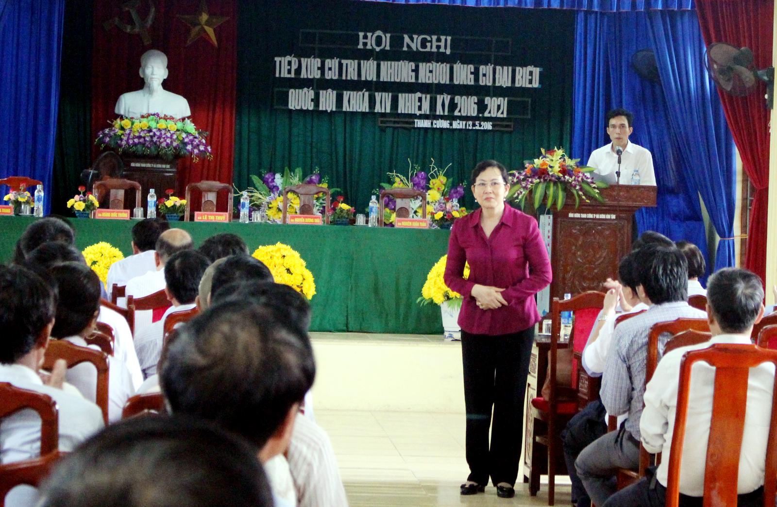 “Khi được cử tri quan tâm, ủng hộ, tin tưởng bầu là ĐBQH Khóa XIV để hoạt động chuyên trách, tôi sẽ có cơ hội dành toàn bộ thời gian để thực hiện Chương trình hành động này và làm cầu nối giữa huyện với các cơ quan, Bộ, ngành Trung ương để cùng chung sức với Đảng bộ, chính quyền và nhân dân trong huyện hoàn thành các mục tiêu mà Đại hội lần thứ 24 của huyện đã đề ra; chung sức xây dựng huyện Thanh Hà ngày càng phát triển; đời sống của nhân dân ngày càng nâng cao”, ứng cử viên Lê Thị Thủy, Phó Tổng Thanh tra nhấn mạnh.