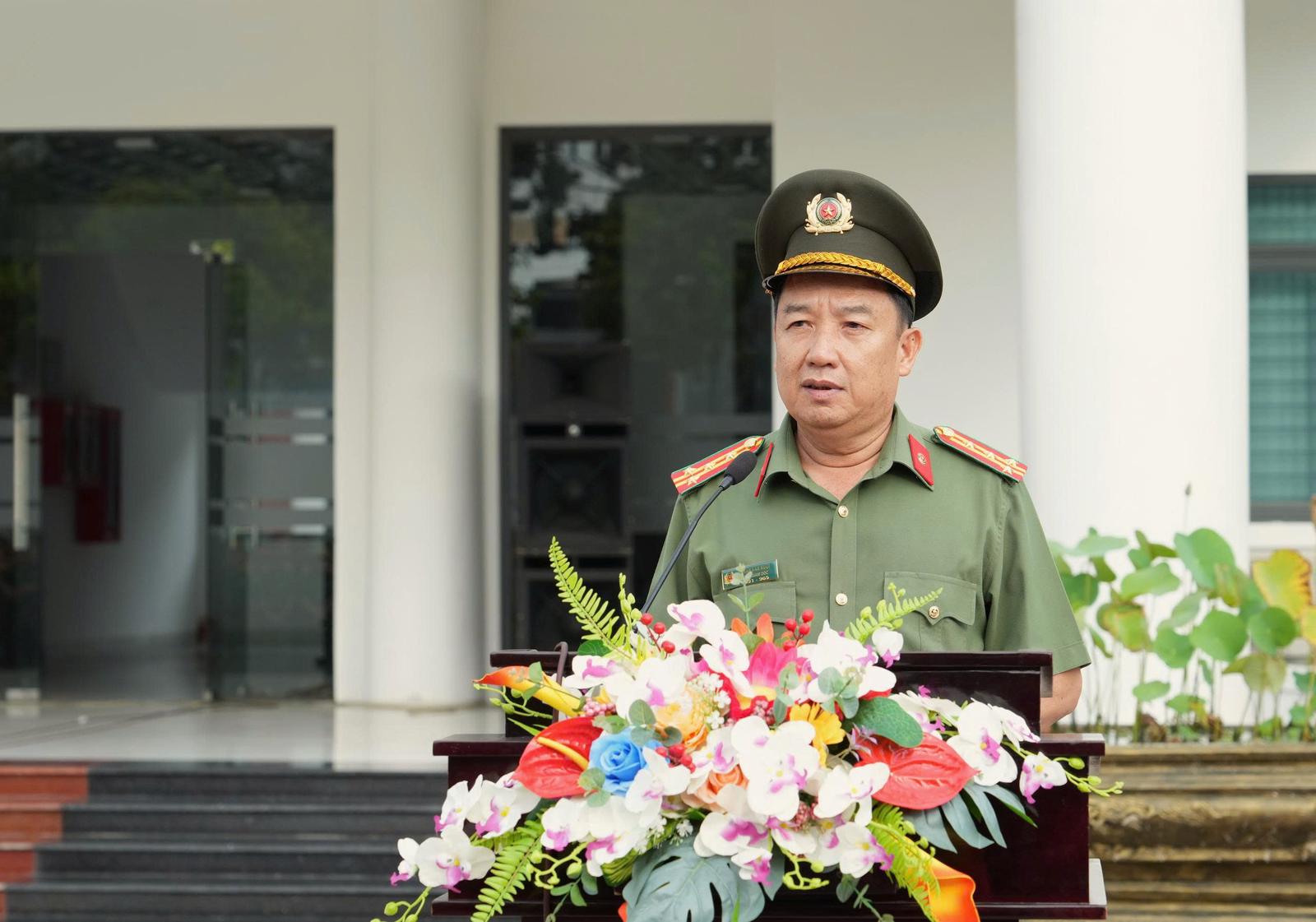 Đại tá Trần Văn Mười, Phó Bí thư Đảng ủy, Phó Giám đốc Công an tỉnh phát biểu tại Lễ chào cờ tháng 6/2025. Ảnh: Như Ý