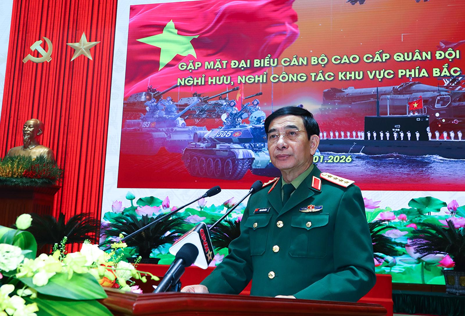 Tại buổi gặp mặt, Đại tướng Phan Văn Giang, Bộ trưởng Bộ Quốc phòng bày tỏ vui mừng khi được đón tiếp các cán bộ cao cấp quân đội nghỉ hưu và nghỉ công tác đúng dịp toàn Đảng, toàn quân đang thi đua lập thành tích chào mừng Đại hội XIV của Đảng và chuẩn bị đón Tết cổ truyền Bính Ngọ 2026.