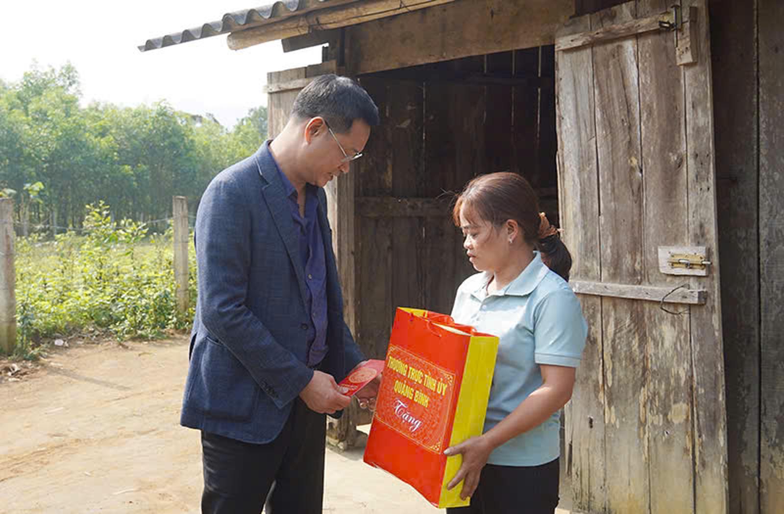 Bí thư Tỉnh ủy Quảng Bình Lê Ngọc Quang trao quà cho một hộ nghèo tại Minh Hóa. Ảnh: XP