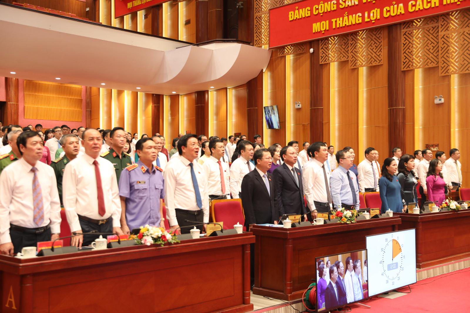 Đại biểu HĐND tỉnh Quảng Ninh chào cờ khai mạc kỳ họp. Ảnh: TTTT
