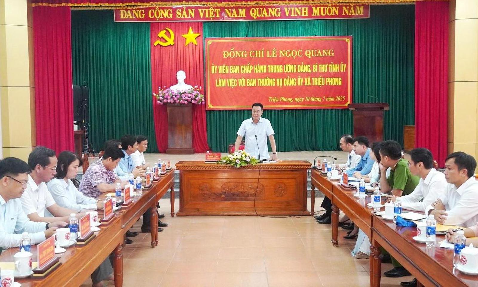 Mới đây, trong chuyến thăm và làm việc tại xã Triệu Phong, Bí thư Tỉnh ủy Quảng Trị Lê Ngọc Quang biểu dương những kết quả bước đầu mà xã đạt được sau sáp nhập. Để tiếp tục hoàn thiện mô hình chính quyền hai cấp và thực hiện thắng lợi nhiệm vụ 6 tháng cuối năm 2025, Bí thư Tỉnh ủy Quảng Trị Lê Ngọc Quang đề nghị xã tập trung rà soát, kiện toàn đội ngũ cán bộ chủ chốt, hài hòa giữa kế thừa và đổi mới, giữa năng lực chuyên môn và phẩm chất chính trị; khẩn trương hoàn thiện các quy chế làm việc của cấp ủy, chính quyền, Mặt trận và các đoàn thể theo mô hình mới.