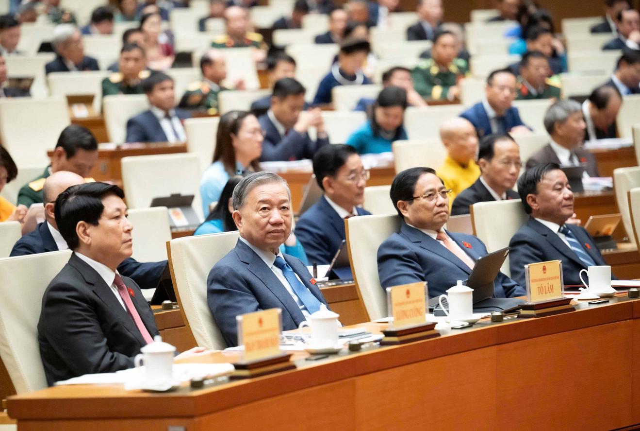 Tổng Bí thư Tô Lâm, Chủ tịch nước Lương Cường, Thủ tướng Phạm Minh Chính, Thường trực Ban Bí thư Trần Cẩm Tú và các đại biểu Quốc hội tại kỳ họp 10. Ảnh: P.Thắng