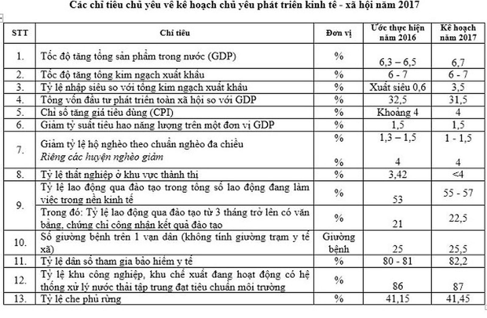 Các chỉ tiêu chủ yếu về kế hoạch phát triển kinh tế - xã hội năm 2017 được Quốc hội thông qua