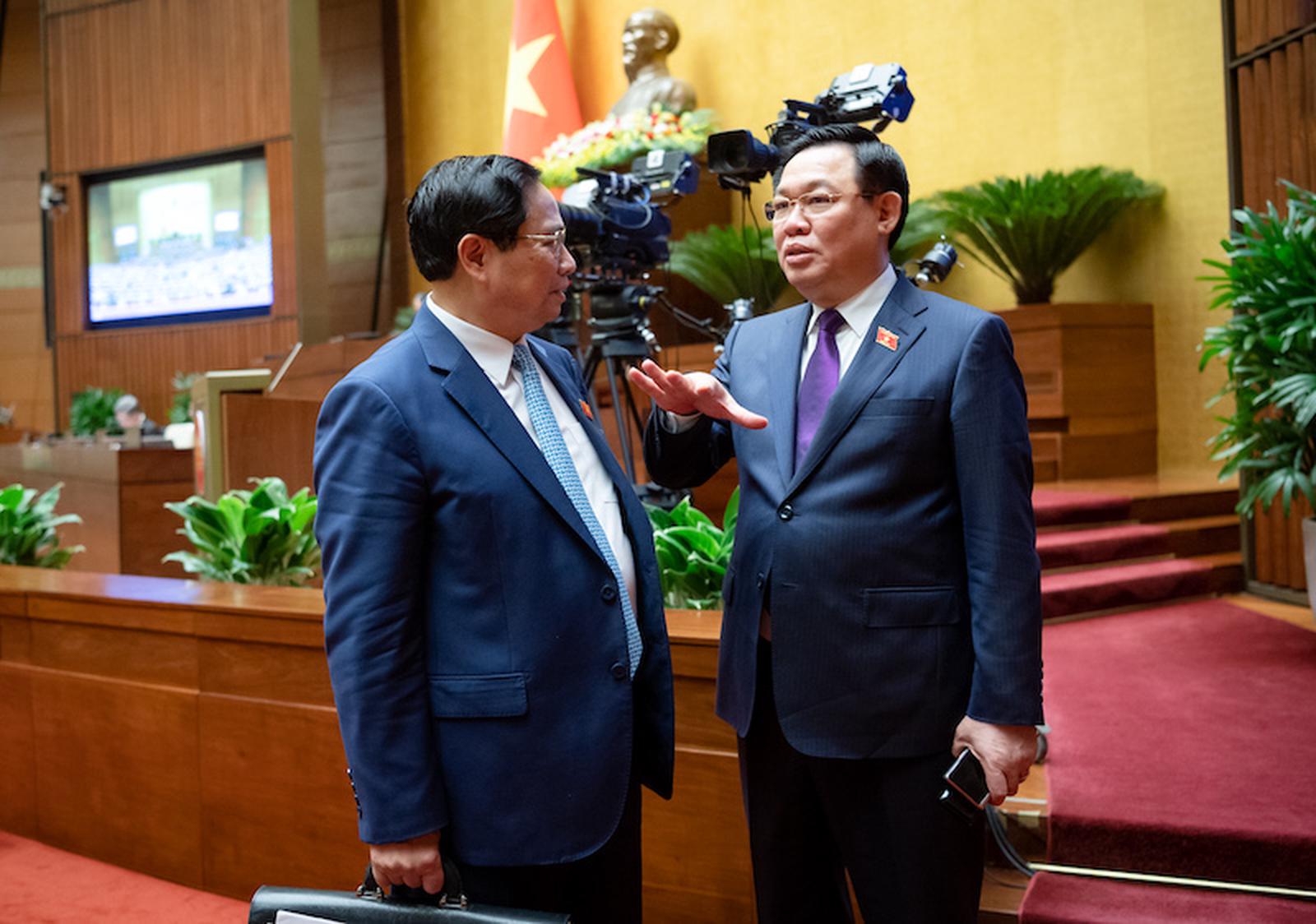 Chủ tịch Quốc hội Vương Đình Huệ và Thủ tướng Chính phủ Phạm Minh Chính bên hành lang kỳ họp Quốc hội. Ảnh: P.Thắng