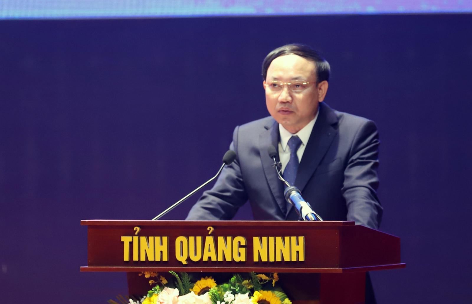 Bí thư Tỉnh ủy Quảng Ninh Nguyễn Xuân Ký trình bày tham luận về giải pháp triển khai thực hiện Nghị quyết số 30-NQ/TW của Bộ Chính trị về phát triển kinh tế - xã hội và bảo đảm quốc phòng, an ninh vùng đồng bằng sông Hồng đến năm 2030, tầm nhìn đến năm 2045. Ảnh: TTTT