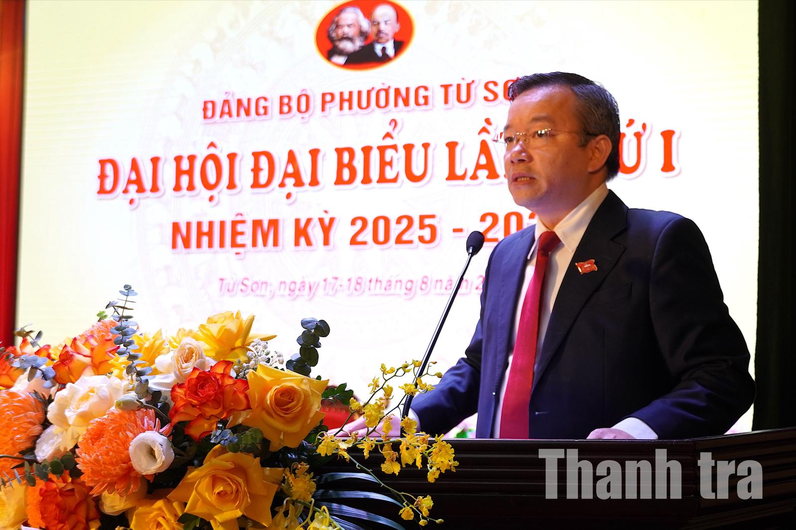 Phát biểu tại Đại hội, Bí thư Đảng uỷ phường Từ Sơn Đỗ Tuấn Sơn cho biết, với truyền thống đoàn kết, ý chí vươn lên và nền tảng thành tựu nhiệm kỳ 2020-2025, Đảng bộ, chính quyền và Nhân dân phường Từ Sơn đang mở ra chặng đường mới, hướng tới mục tiêu xây dựng đô thị thông minh, hiện đại, giàu bản sắc. Diện mạo đô thị ngày càng khang trang, hạ tầng đồng bộ, kinh tế - xã hội phát triển hài hòa cùng việc bảo tồn giá trị văn hóa Kinh Bắc, tạo tiền đề vững chắc để hiện thực hóa khát vọng về một Từ Sơn thịnh vượng và văn minh.