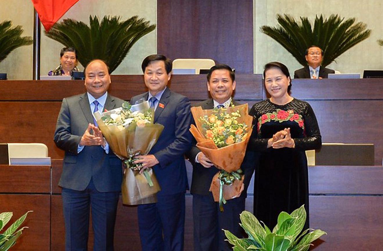 Thủ tướng Chính phủ Nguyễn Xuân Phúc và Chủ tịch Quốc hội Nguyễn Thị Kim Ngân tặng hoa chúc mừng Tổng Thanh tra Chính phủ Lưu Minh Khái và Bộ trưởng Bộ Giao thông Vận tải Nguyễn Văn Thể được quốc hội phê chuẩn