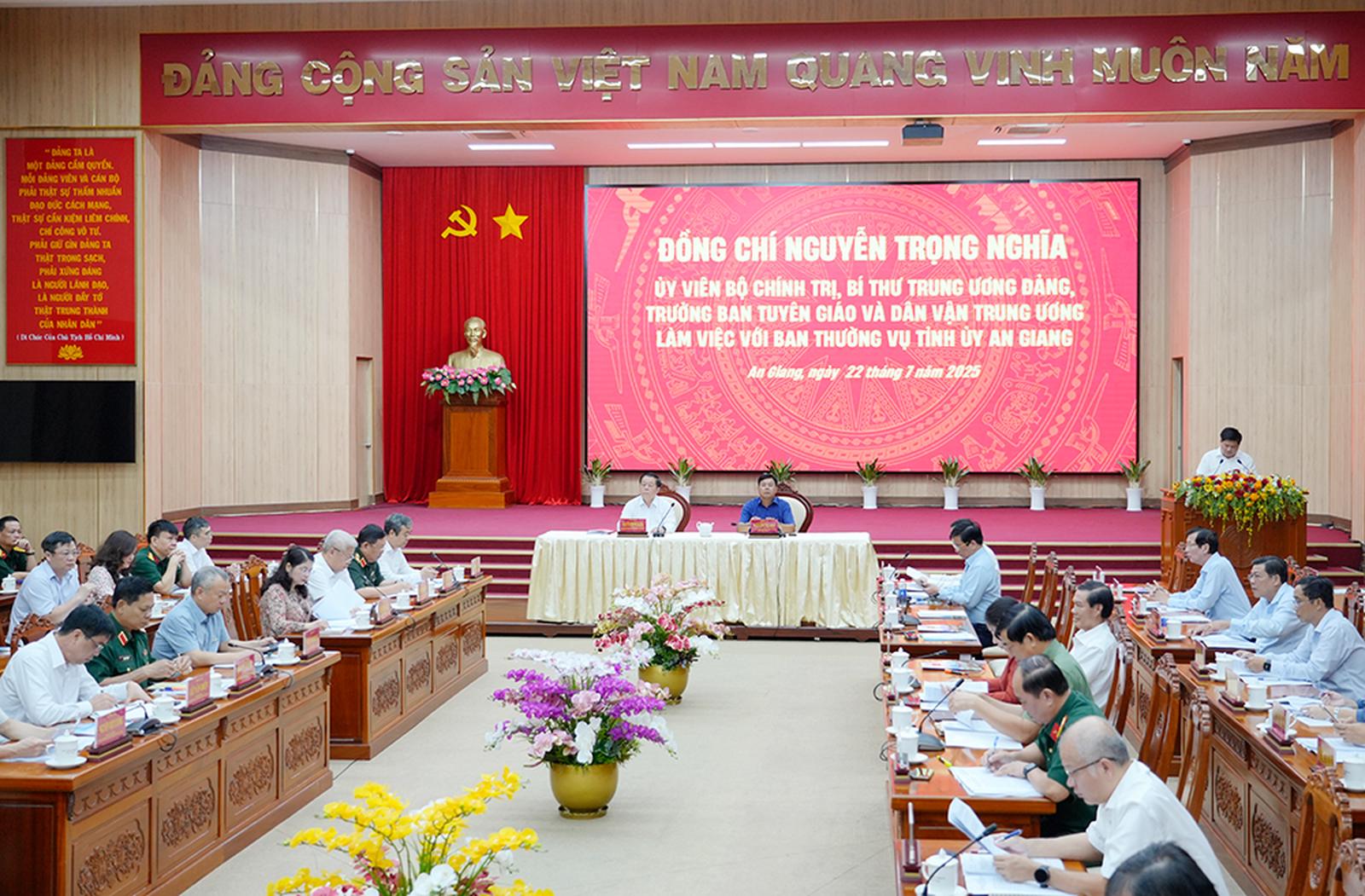 Ngày 22/7, Đoàn công tác của Trung ương do Ủy viên Bộ Chính trị, Bí thư Trung ương Đảng, Trưởng ban Tuyên giáo và Dân vận Trung ương Nguyễn Trọng Nghĩa làm Trưởng đoàn đã làm việc với Ban Thường vụ Tỉnh ủy An Giang.
