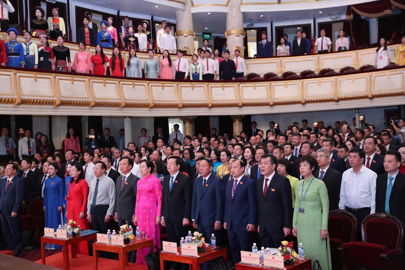 Các đại biểu tham dự Đại hội thực hiện nghi thức chào cờ, hát Quốc ca, Quốc tế ca