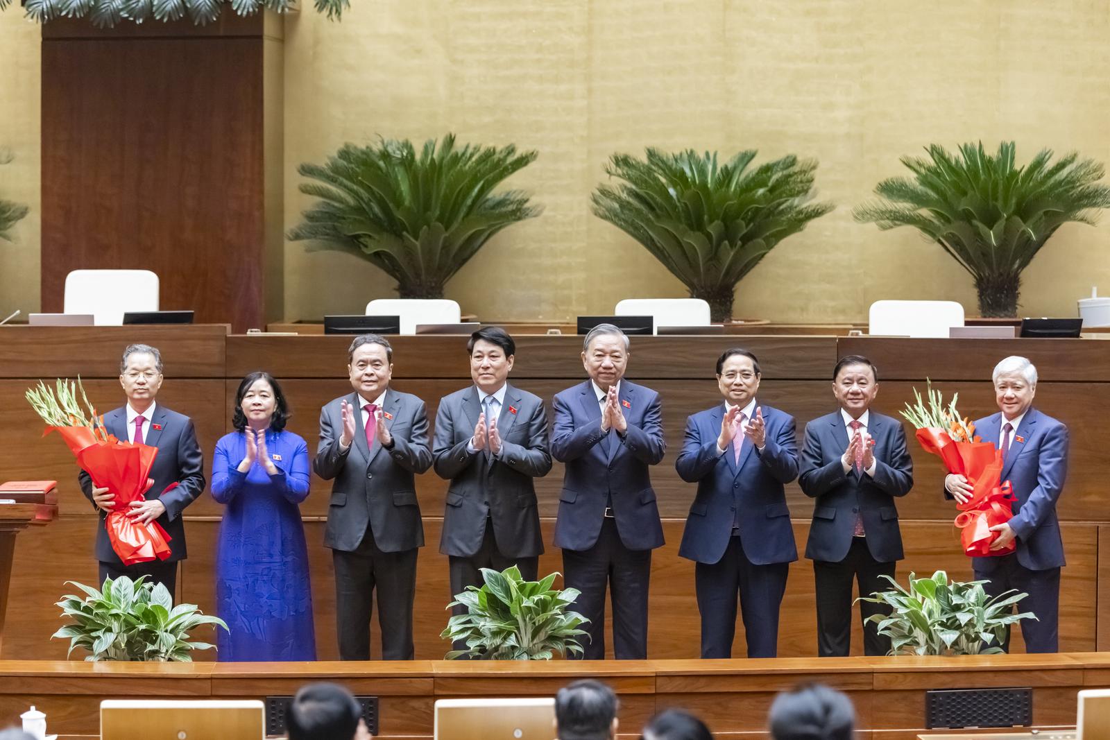 Tổng Bí thư Tô Lâm, Chủ tịch nước Lương Cường, Thủ tướng Phạm Minh Chính, Chủ tịch Quốc hội Trần Thanh Mẫn và các lãnh đạo Đảng, Nhà nước tặng hoa chúc mừng Chánh án TAND Tối cao Nguyễn Văn Quảng và Phó Chủ tịch Quốc hội Đỗ Văn Chiến. Ảnh: P.Thắng