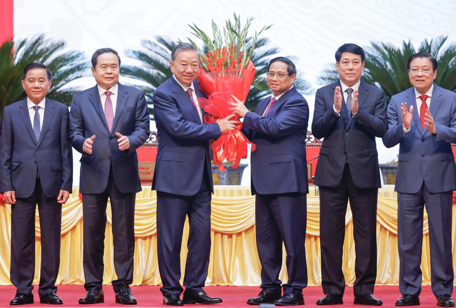 Các lãnh đạo chúc mừng Tổng Bí thư, Chủ tịch nước Tô Lâm. Ảnh: N.Bắc