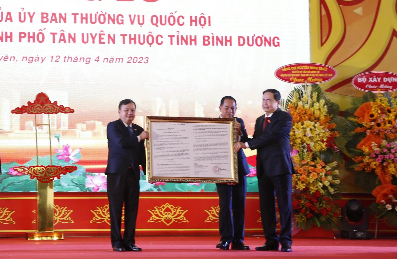 Phó Chủ tịch Thường trực Quốc hội Trần Thanh Mẫn trao nghị quyết của Uỷ ban Thường vụ Quốc hội lập TP mới cho UBND TP Tân Uyên. Ảnh: A.X