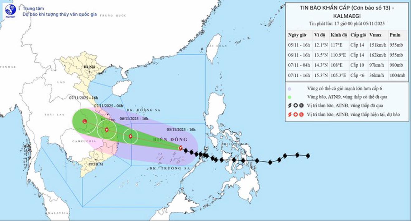 Bão số 13 đang di chuyển nhanh về phía vùng biển và đất liền khu vực Trung và Nam Trung Bộ nước ta. Đây là cơn bão được dự báo khi ảnh hưởng đến đất liền vẫn có cường độ rất mạnh, đổ bộ vào thời kỳ thủy triều cao, phạm vi ảnh hưởng rất rộng, kèm theo mưa cường suất lớn, nguy cơ rất cao xảy ra ngập lụt sâu và lũ ống, lũ quét, sạt lở đất, nhất là ở những nơi đã xảy ra mưa lớn kéo dài những ngày vừa qua.
