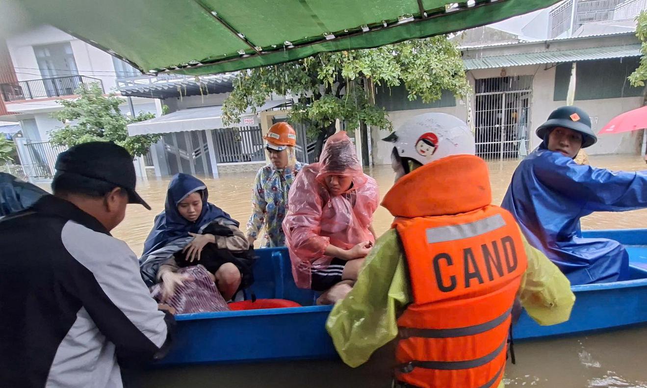 Lực lượng Công an phường An Cựu, TP Huế hỗ trợ người dân đến nơi tránh trú an toàn. Ảnh: CATP Huế