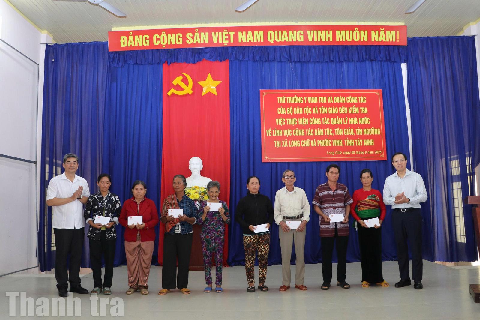 Kết luận buổi làm việc, Thứ trưởng Y Vinh Tơr ghi nhận nỗ lực, sự chủ động của xã Long Chữ và xã Phước Vinh trong việc triển khai kịp thời các chủ trương, chính sách của Đảng và Nhà nước sau 2 tháng thực hiện chính quyền địa phương 2 cấp. Thứ trưởng đề nghị các thành viên đoàn công tác cùng UBND tỉnh tiếp tục đồng hành, kịp thời tháo gỡ khó khăn, đồng thời tổng hợp kiến nghị của cơ sở để tham mưu Bộ Dân tộc và Tôn giáo, UBND tỉnh xem xét giải quyết, đáp ứng nhu cầu thực tiễn của địa phương.