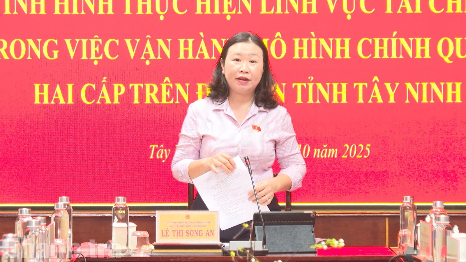 Phó Trưởng đoàn chuyên trách Đoàn ĐBQH tỉnh Tây Ninh Lê Thị Song An đề nghị các cơ quan, đơn vị tiếp tục rà soát, giải quyết dứt điểm những vấn đề còn tồn tại, gắn trách nhiệm cụ thể cho từng ngành, từng cấp. Sở Tài chính cần tăng cường hướng dẫn, hỗ trợ nghiệp vụ cho đội ngũ cán bộ tài chính – kế toán cơ sở, đặc biệt trong chi trả chính sách an sinh xã hội; đồng thời, phối hợp chặt chẽ với Kho bạc Nhà nước trong quản lý, điều hành ngân sách, hoàn thiện hồ sơ pháp lý liên quan đến trụ sở và tài sản công, bảo đảm sử dụng đúng quy định, hiệu quả, tránh lãng phí.