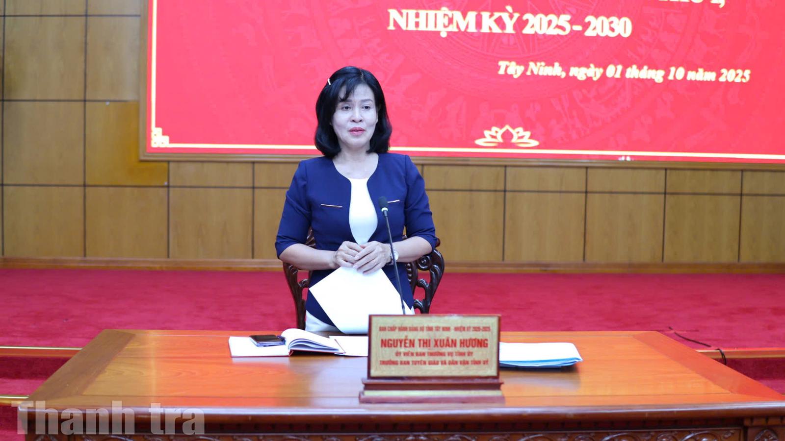 (Thanh tra) - Chiều ngày 1/10, Ban Tuyên giáo và Dân vận Tỉnh uỷ Tây Ninh tổ chức họp báo tuyên truyền về Đại hội đại biểu Đảng bộ tỉnh Tây Ninh lần thứ I, nhiệm kỳ 2025 - 2030. Ủy viên Ban Thường vụ Tỉnh uỷ, Trưởng Ban Tuyên giáo và Dân vận Tỉnh uỷ Nguyễn Thị Xuân Hương chủ trì.