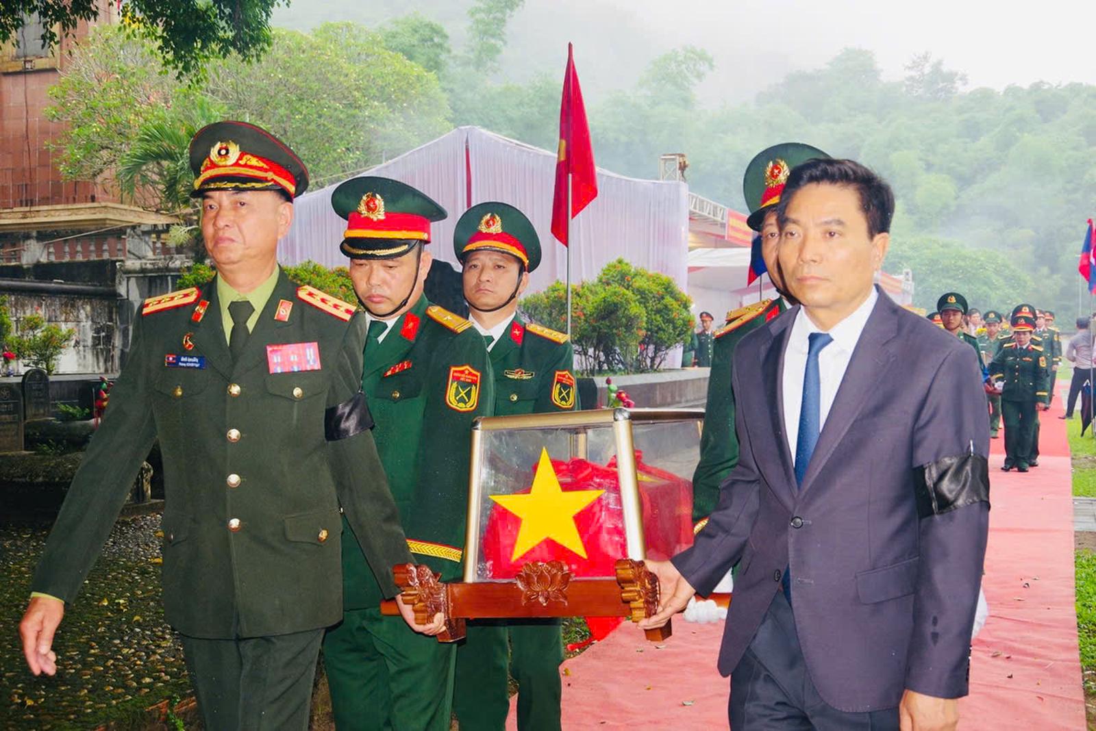 Bí thư Tỉnh ủy Thanh Hóa Nguyễn Doãn Anh và Đại tá Nếch Vị Khạ Chăn, Chính ủy Bộ CHQS tỉnh Hủa Phăn (Lào) đưa hài cốt liệt sĩ đến nơi an nghỉ tại Nghĩa trang Liệt sĩ Quốc tế Đồng Tâm. Ảnh: CTV