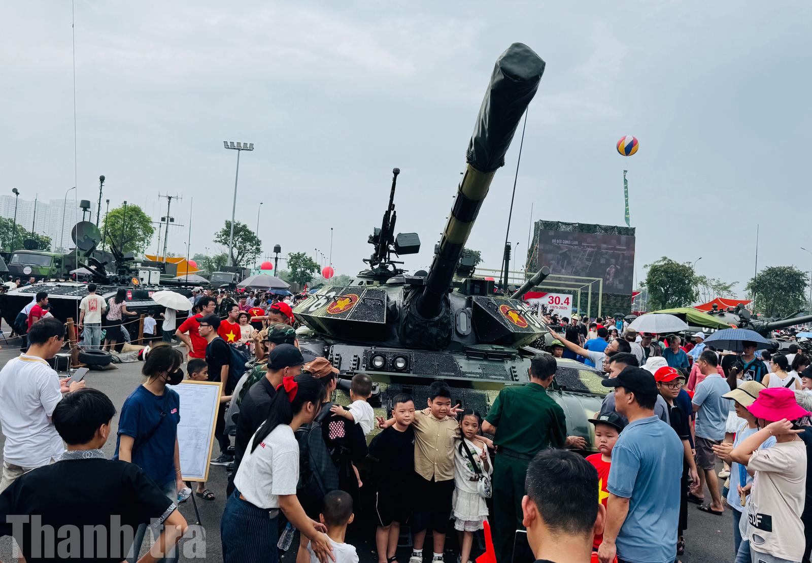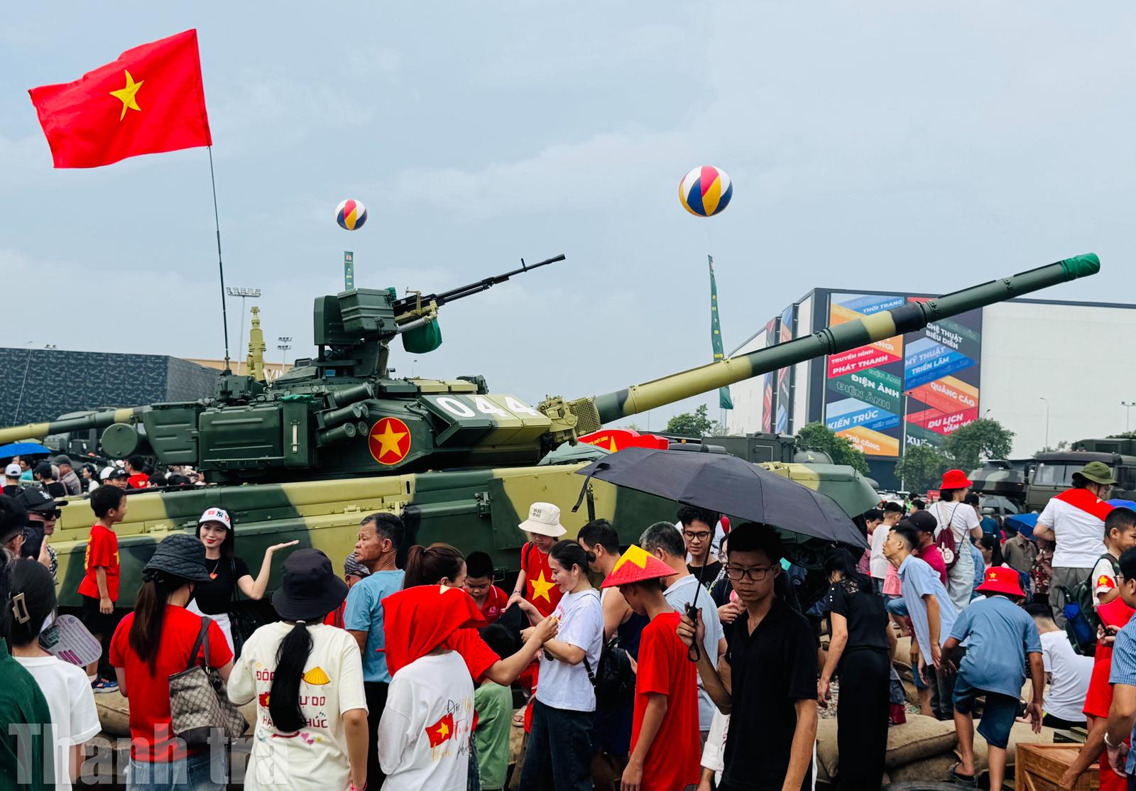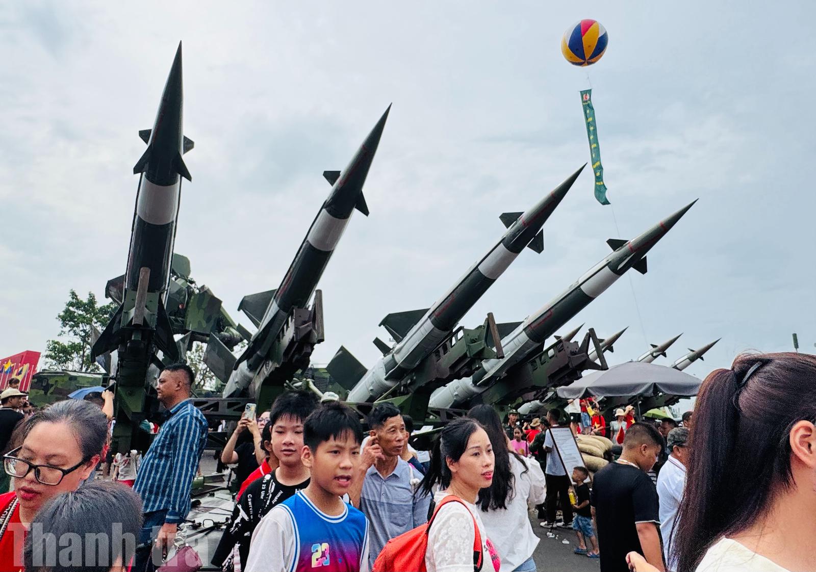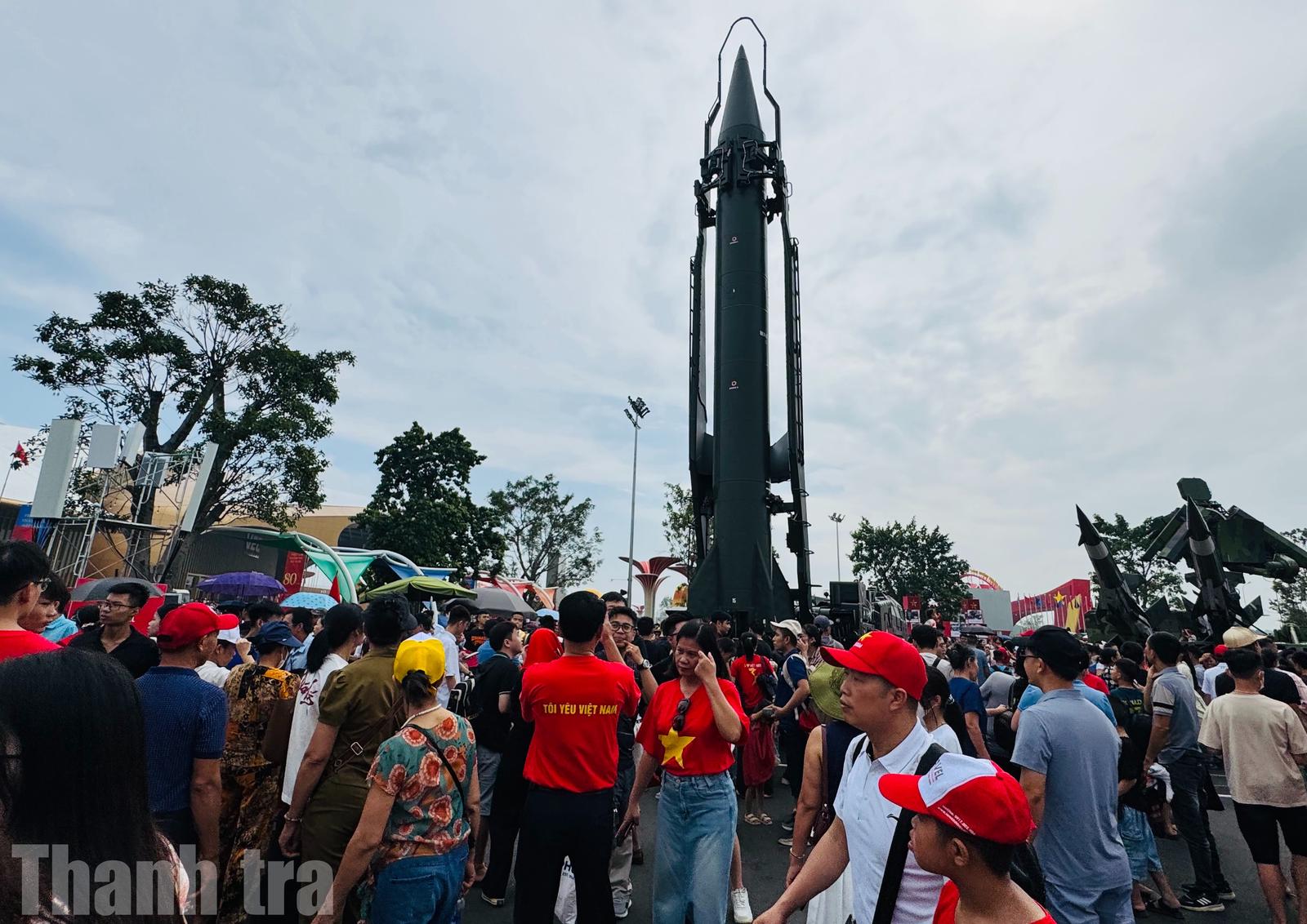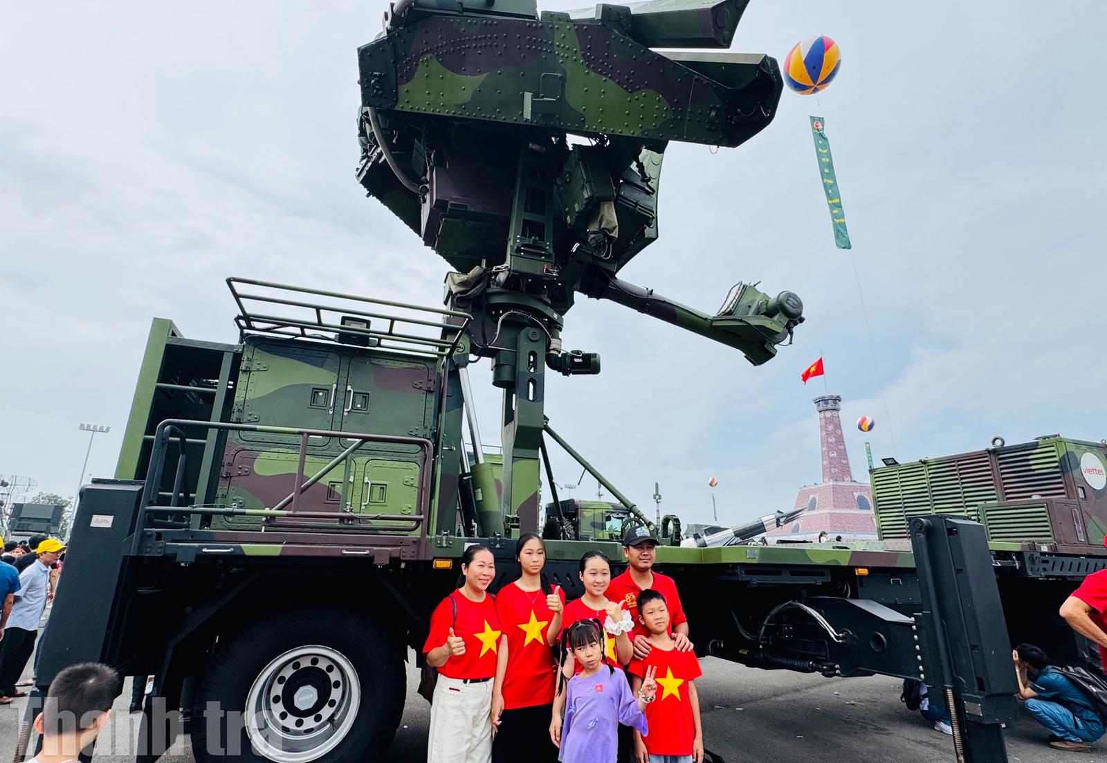 Sự trầm trồ, phấn khích khi được đứng gần cũng như chụp ảnh với những vũ khí, khí tài hiện đại của Quân đội Nhân dân Việt Nam là cảm xúc chung của người dân khi thăm quan tại khu này. Ảnh: Hải Lương