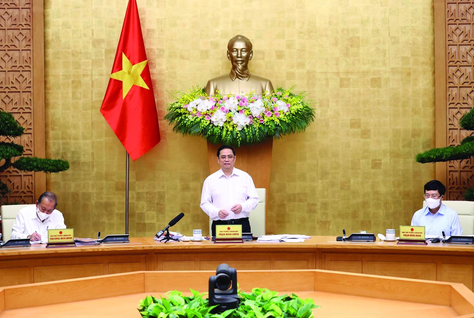 Thủ tướng Phạm Minh Chính yêu cầu các cấp, ngành thực hiện các giải pháp như: tăng cường nhận thức về những khó khăn, thách thức, vướng mắc đang phải đối diện để nỗ lực và lấy đó làm động lực để phấn đấu, vươn lên khẳng định và phát triển; căn cứ chức năng, nhiệm vụ, quyền hạn, bám sát tình hình, nắm chắc tình hình, nhất là tình hình thực tiễn, từ đó có lãnh đạo, chỉ đạo kịp thời, đúng hướng, sát tình hình, khả thi và mang lại hiệu quả rõ rệt trong phòng chống dịch và phát triển kinh tế - xã hội; xây dựng chính sách tiền tệ, tài khóa hài hòa, hợp lý để vừa bảo đảm kiềm chế lạm phát, vừa đảm bảo tăng trưởng; tập trung tháo gỡ khó khăn, vướng mắc còn tồn tại liên quan thể chế, cơ chế, chính sách, nhất là liên quan đến vaccine, đầu tư công, kinh tế vĩ mô, các dự án thua lỗ, yếu kém; siết chặt kỷ luật, kỷ cương tài chính, ngân sách, đặc biệt là tiết kiệm ngân sách để chi cho các trọng điểm và vùng đặc biệt khó khăn; khẩn trương hoàn thiện, ban hành Nghị quyết về chính sách cho lao động, người sử dụng lao động, doanh nghiệp bị tác động bởi dịch COVID-19; tiếp tục kiểm soát xuất nhập cảnh, xử lý nghiêm hành vi xuất nhập cảnh, cư trú trái phép...