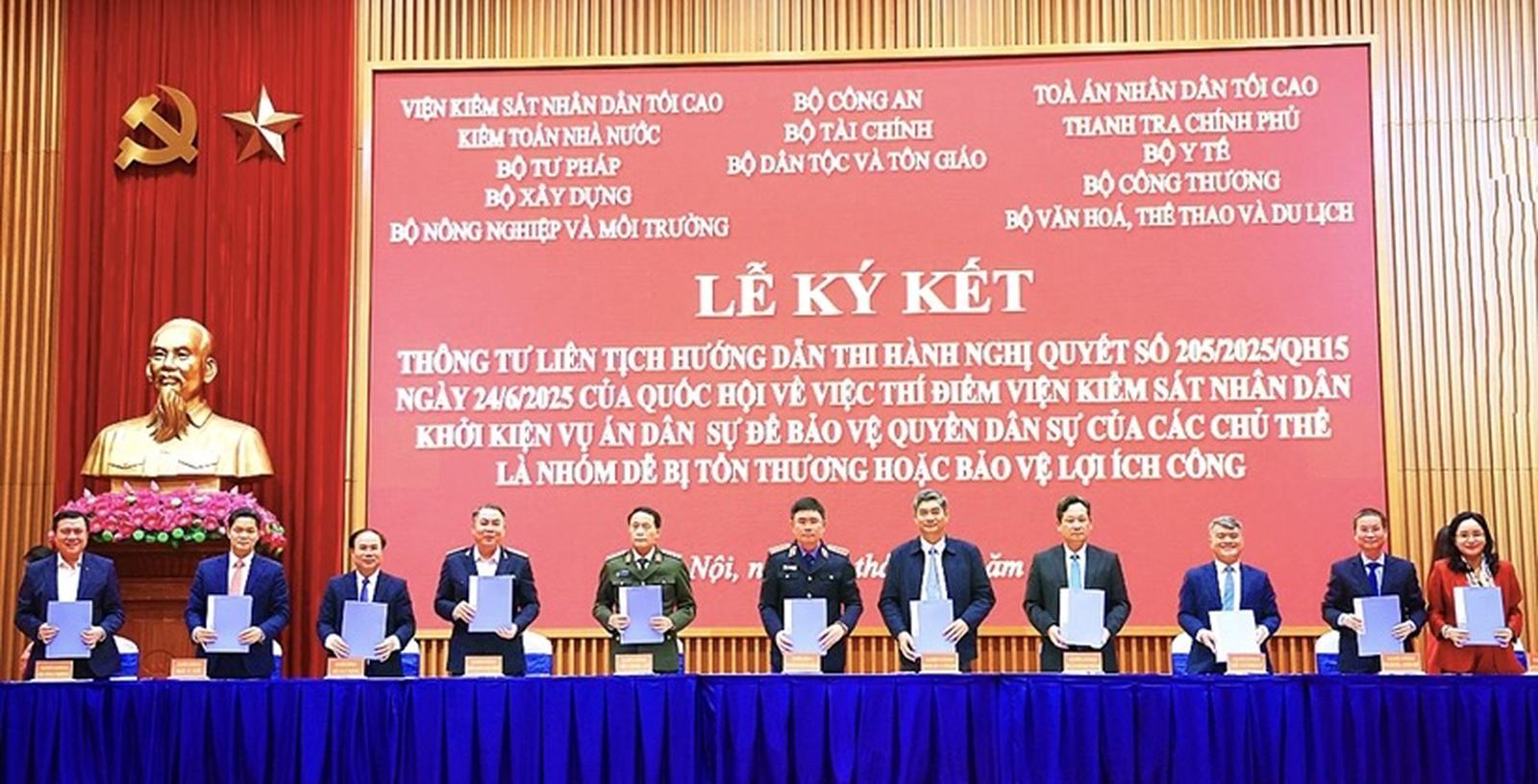 (Thanh tra) - Chiều 3/11, Thanh tra Chính phủ đã tham gia Lễ ký kết Thông tư liên tịch hướng dẫn thi hành Nghị quyết số 205/2025/QH15 ngày 24/6/2025 của Quốc hội về việc thí điểm Viện Kiểm sát Nhân dân (VKSND) khởi kiện vụ án dân sự để bảo vệ quyền dân sự của các chủ thể là nhóm dễ bị tổn thương hoặc bảo vệ lợi ích công (Nghị quyết số 205).