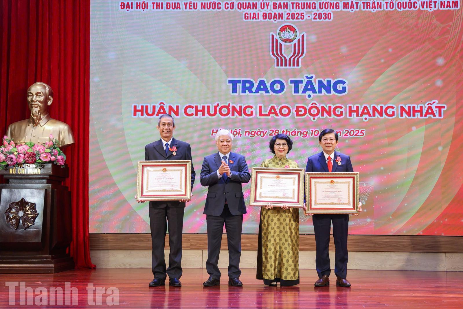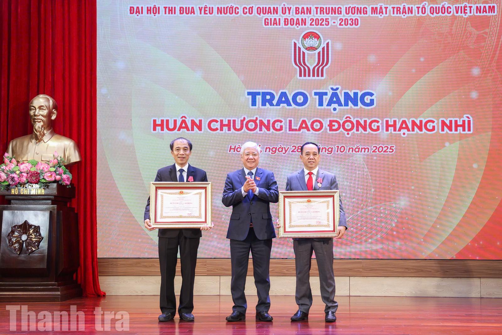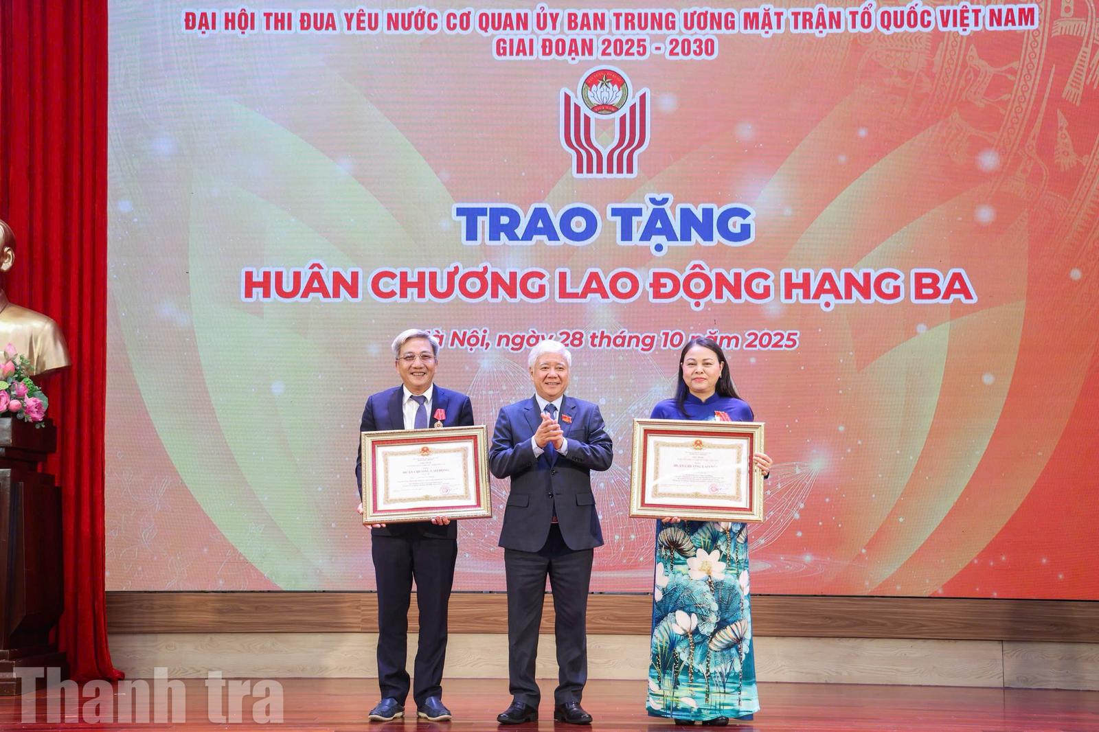 Thừa uỷ quyền của Chủ tịch Nước, đồng chí Đỗ Văn Chiến, Ủy viên Bộ Chính trị, Bí thư Trung ương Đảng, Chủ tịch Ủy ban Trung ương MTTQ Việt Nam, Phó Chủ tịch Hội đồng Thi đua - Khen thưởng Trung ương tặng thưởng Huân chương Lao động hạng Ba cho đồng chí Nguyễn Thị Thu Hà, Ủy viên Trung ương Đảng, Phó Chủ tịch, Tổng Thư ký Uỷ ban Trung ương MTTQ Việt Nam; đồng chí Nguyễn Văn Thịnh, nguyên Phó Bí thư Thường trực Đảng ủy Cơ quan. Ảnh: Trí Vũ