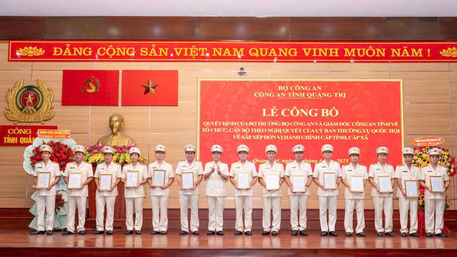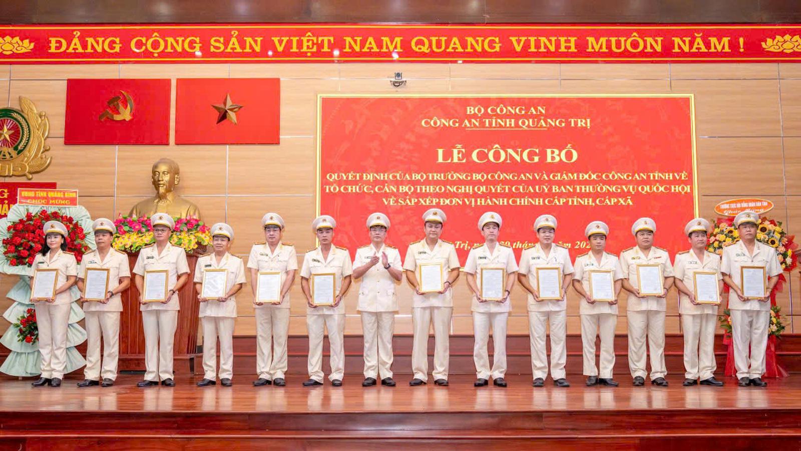 Bộ Công an cũng đã ban hành quyết định thành lập Công an cấp xã của tỉnh Quảng Trị, gồm: Thành lập 8 Công an phường, 69 Công an xã và 1 Công an đặc khu Cồn Cỏ trên cơ sở Đồn Công an Cồn Cỏ. Đồng thời, điều động cán bộ, chiến sĩ Công an tỉnh Quảng Bình đến nhận công tác tại Công an tỉnh Quảng Trị. Quyết định có hiệu lực thi hành kể từ ngày 1/7/2025.