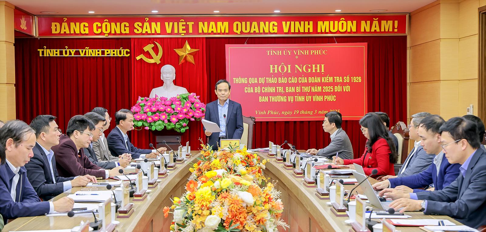 (Thanh tra) - Ngày 19/3, Đoàn Kiểm tra số 1926 của Bộ Chính trị, Ban Bí thư do Bí thư Trung ương Đảng, Trưởng Ban Chính sách, chiến lược Trung ương Trần Lưu Quang làm Trưởng đoàn đã có buổi làm việc với Ban Thường vụ Tỉnh ủy Vĩnh Phúc để thông qua “Dự thảo báo cáo kết quả kiểm tra đối với Ban Thường vụ Tỉnh ủy Vĩnh Phúc”.
