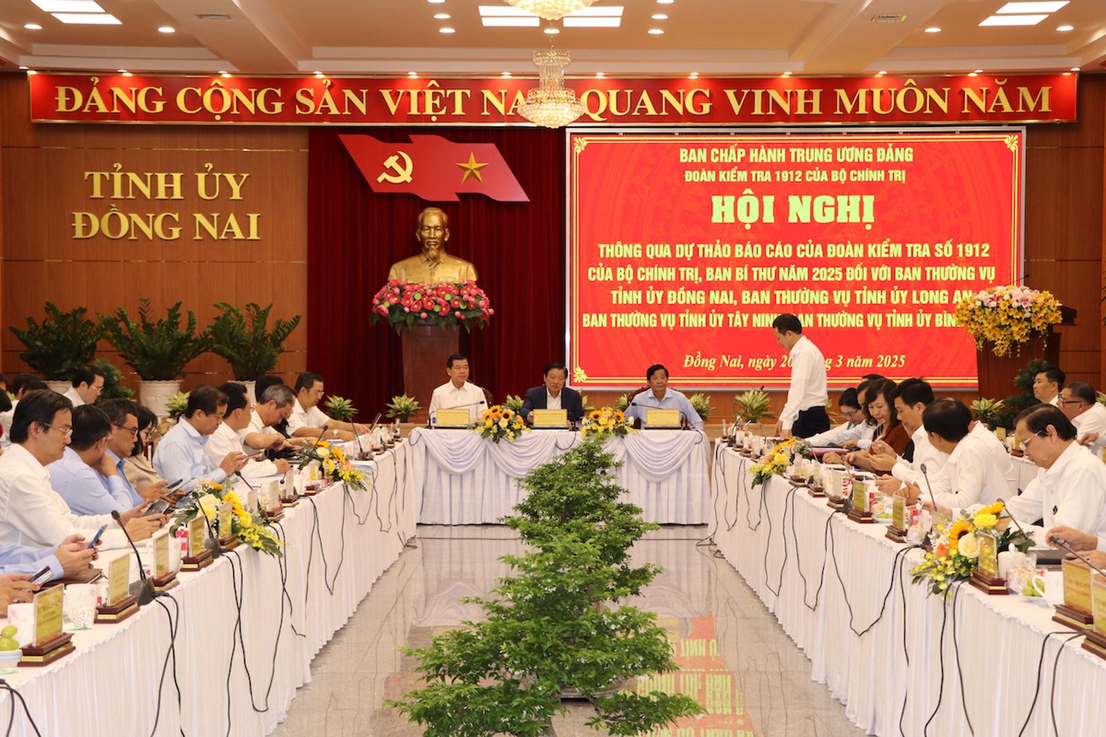 (Thanh tra) - Sáng 20/3, Đoàn kiểm tra số 1912 của Bộ Chính trị, Ban Bí thư năm 2025 do ông Phan Đình Trạc, Trưởng Ban Nội chính Trung ương, Trưởng Đoàn kiểm tra đã chủ trì hội nghị thông qua dự thảo báo cáo kết quả kiểm tra với Ban Thường vụ Tỉnh ủy 4 tỉnh: Đồng Nai, Bình Phước, Long An và Tây Ninh.