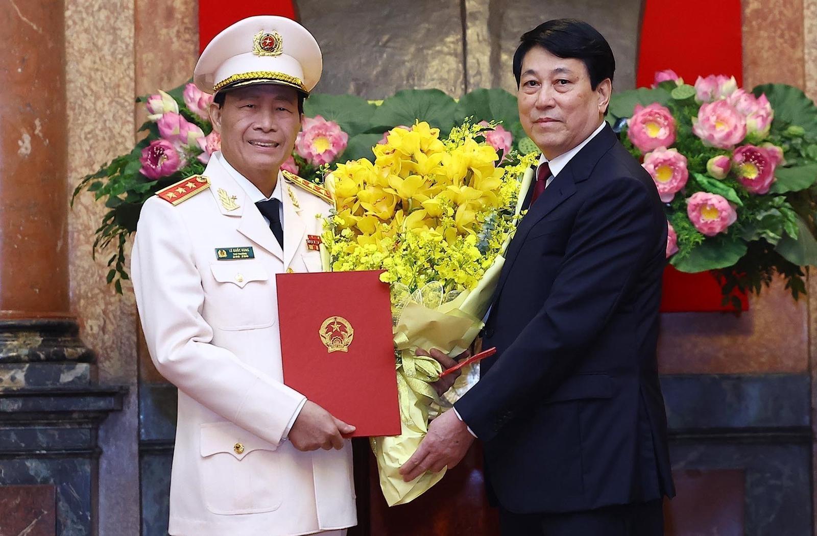 Chủ tịch nước Lương Cường trao quyết định thăng cấp bậc hàm Thượng tướng với Thứ trưởng Bộ Công an Lê Quốc Hùng. Ảnh: TTXVN