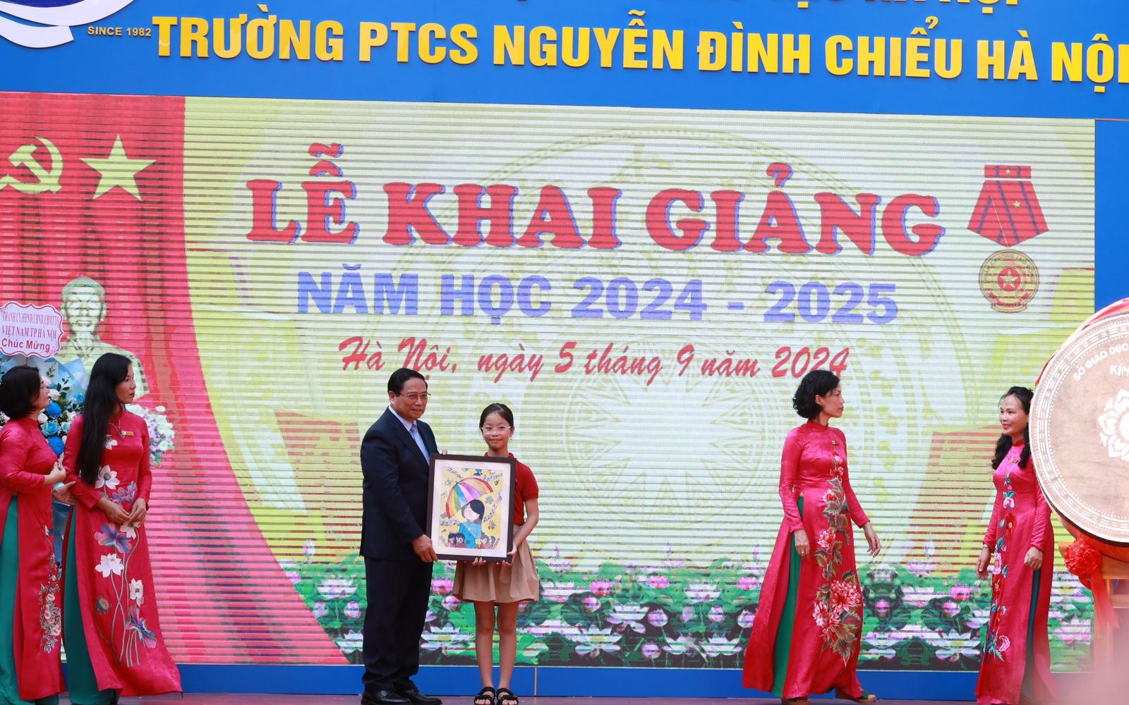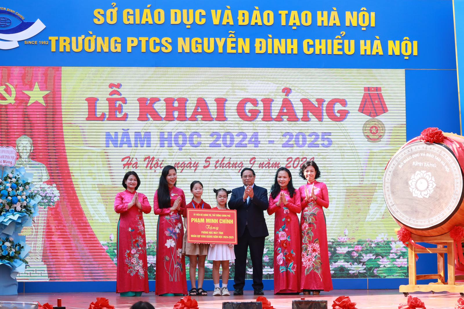 Thủ tướng Chính phủ Phạm Minh Chính tặng quà cho học sinh nhà trường. Ảnh: HH