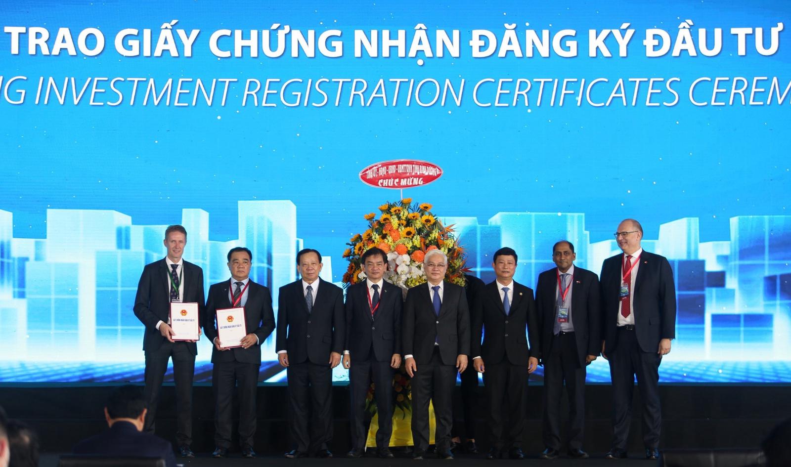 Lãnh đạo tỉnh Bình Dương trao giấy chứng nhận đầu tư, biên bản ghi nhớ cho các nhà đầu tư. Ảnh: A.X