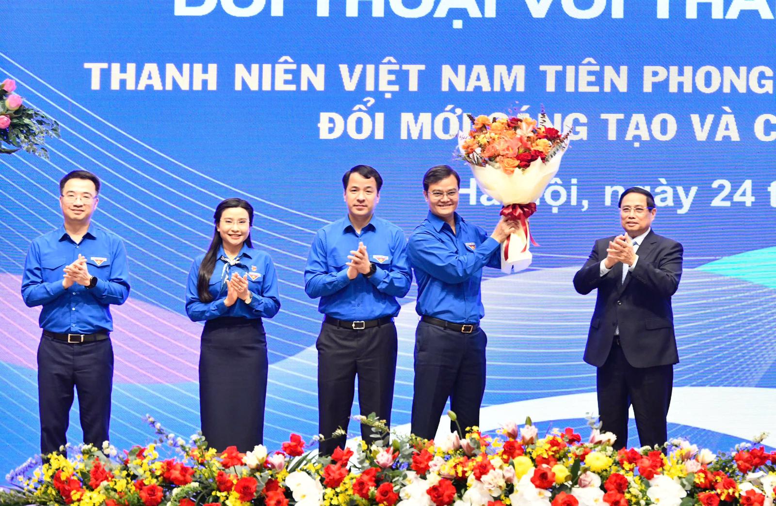 Thủ tướng Chính phủ Phạm Minh Chính tặng hoa chúc mừng Ban Bí thư Trung ương Đoàn nhân dịp kỷ niệm 94 năm ngày thành lập Đoàn Thanh niên cộng sản Hồ Chí Minh. Ảnh: N.Bắc