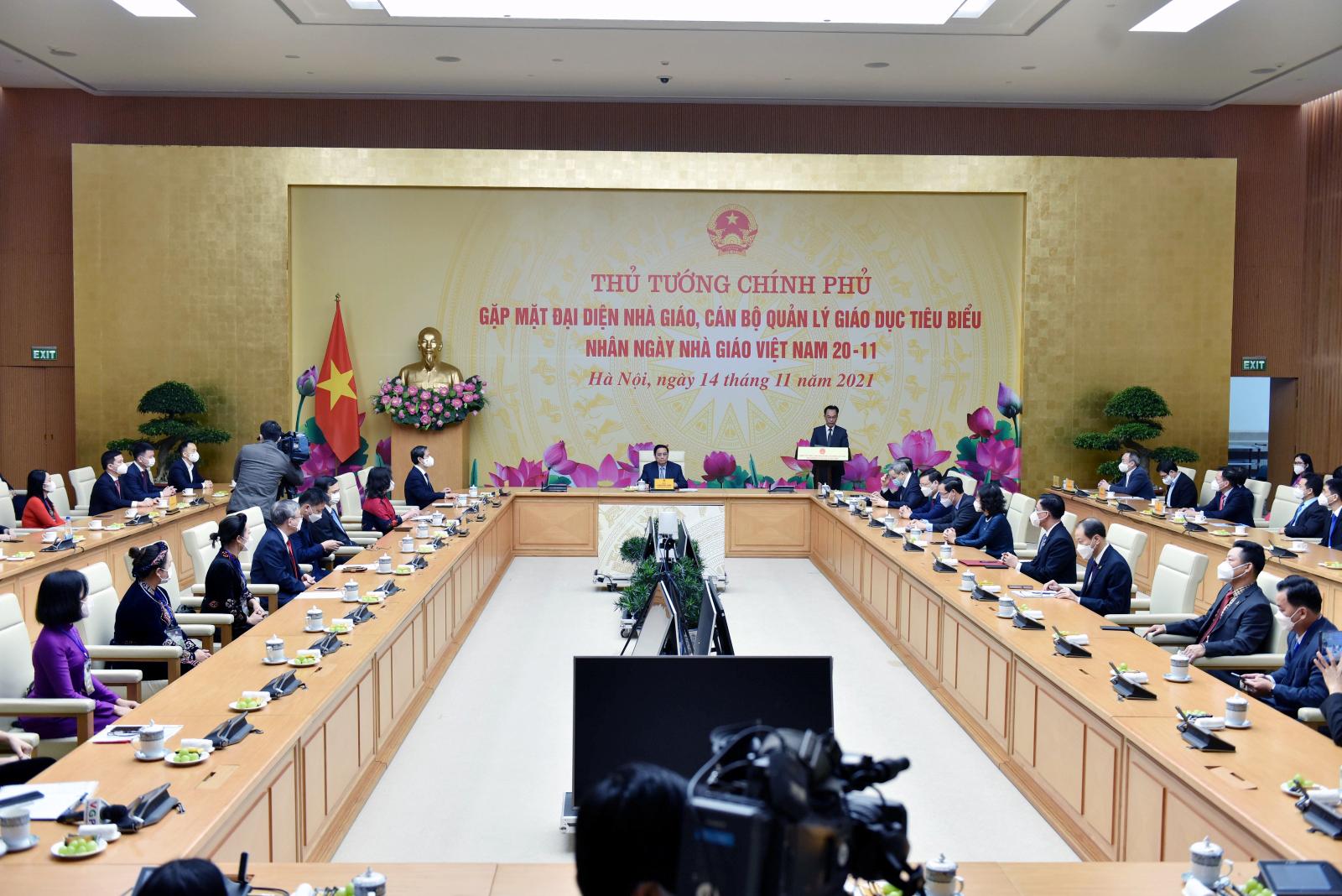 Báo cáo tại buổi gặp mặt, Bộ trưởng Bộ Giáo dục và Đào tạo Nguyễn Kim Sơn khẳng định, được Thủ tướng Chính phủ quan tâm, dành thời gian gặp mặt các nhà giáo, cán bộ quản lý giáo dục tiêu biểu nhân Ngày Nhà giáo Việt Nam (20/11) là vinh dự, nguồn cổ vũ, động viên lớn lao để đội ngũ nhà giáo, cán bộ quản lý giáo dục trên mọi miền cả nước tiếp tục nỗ lực phấn đấu, trau dồi chuyên môn nghiệp vụ, say mê học hỏi, đổi mới, sáng tạo để thực hiện tốt hơn nhiệm vụ “trồng người” cao quý, nhất là trong bối cảnh dịch bệnh Covid-19 đang ảnh hưởng nghiêm trọng đến các hoạt động của ngành.