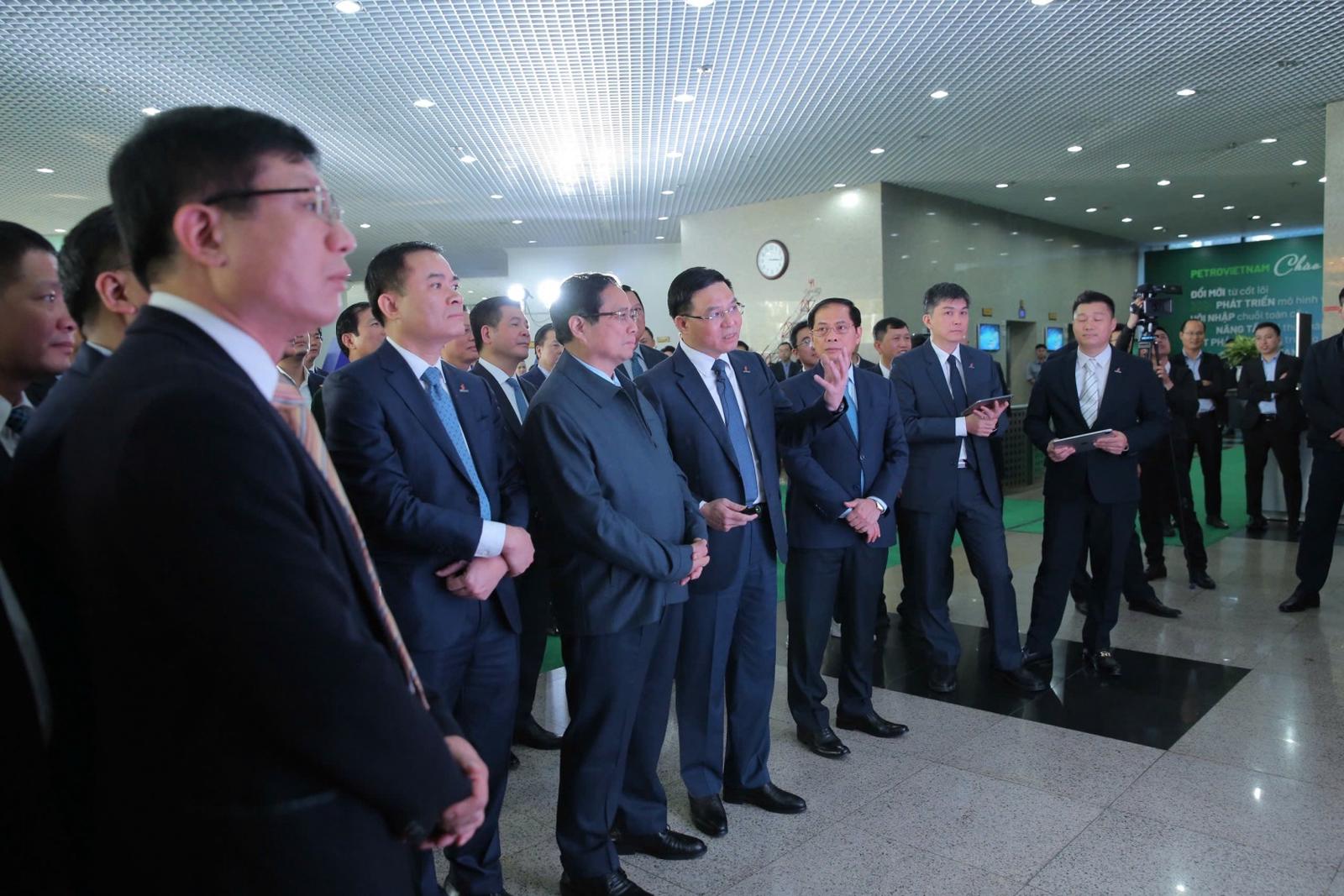 Thủ tướng Phạm Minh Chính nghe lãnh đạo Petrovietnam giới thiệu về các đổi mới trong hoạt động, ứng dụng khoa học công nghệ của Tập đoàn