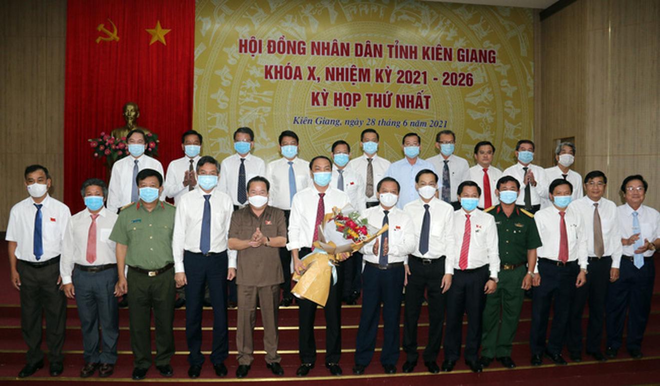 Chủ tịch, các Phó Chủ UBND tỉnh Kiên Giang và các thành viên UBND tỉnh nhiệm kỳ mới. Ảnh: TTXVN