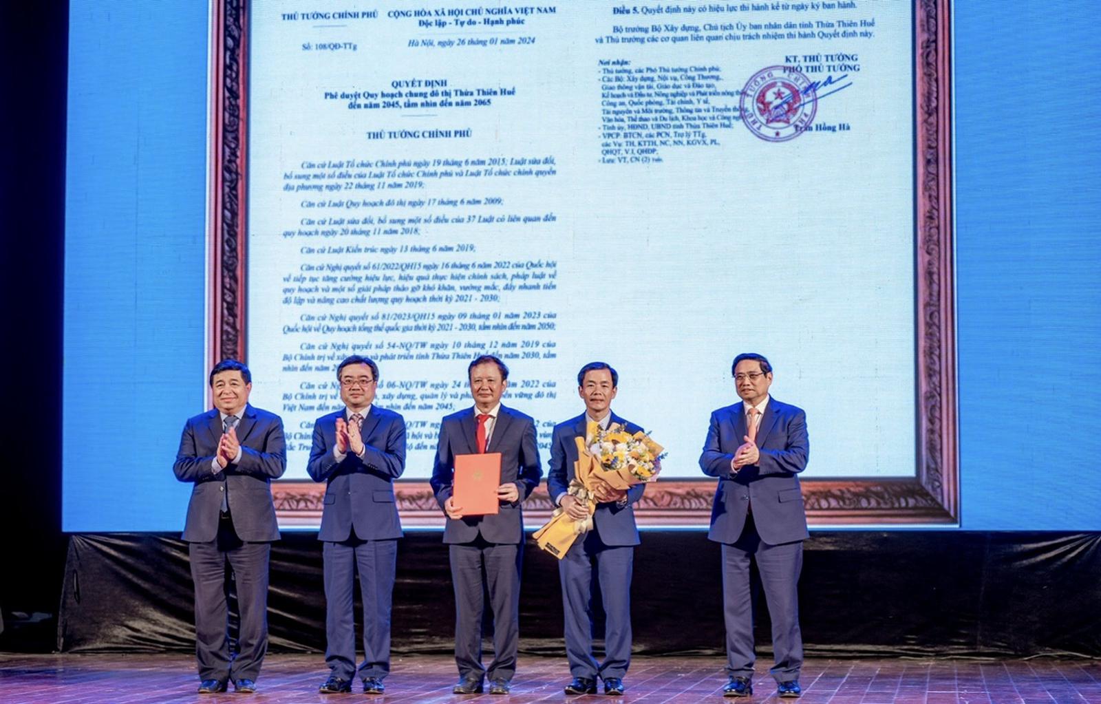 Thủ tướng Chính phủ Phạm Minh Chính trao quyết định phê duyệt quy hoạch Thừa Thiên Huế. Ảnh: P.B