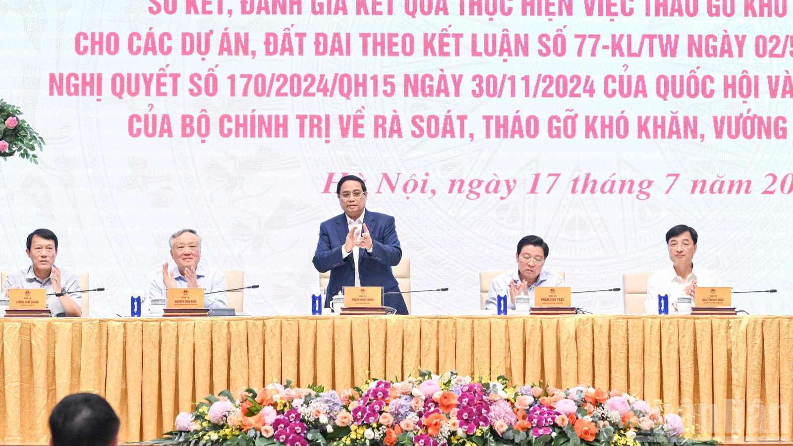 Chiều 17/7, Thủ tướng Chính phủ Phạm Minh Chính chủ trì Hội nghị toàn quốc sơ kết, đánh giá kết quả thực hiện việc tháo gỡ khó khăn, vướng mắc cho các dự án, đất đai theo Kết luận số 77 ngày 2/5/2024 của Bộ Chính trị, Nghị quyết số 170 ngày 30/11/2024 của Quốc hội và triển khai ý kiến chỉ đạo của Bộ Chính trị về rà soát, tháo gỡ khó khăn, vướng mắc cho các dự án tồn đọng trên phạm vi cả nước.