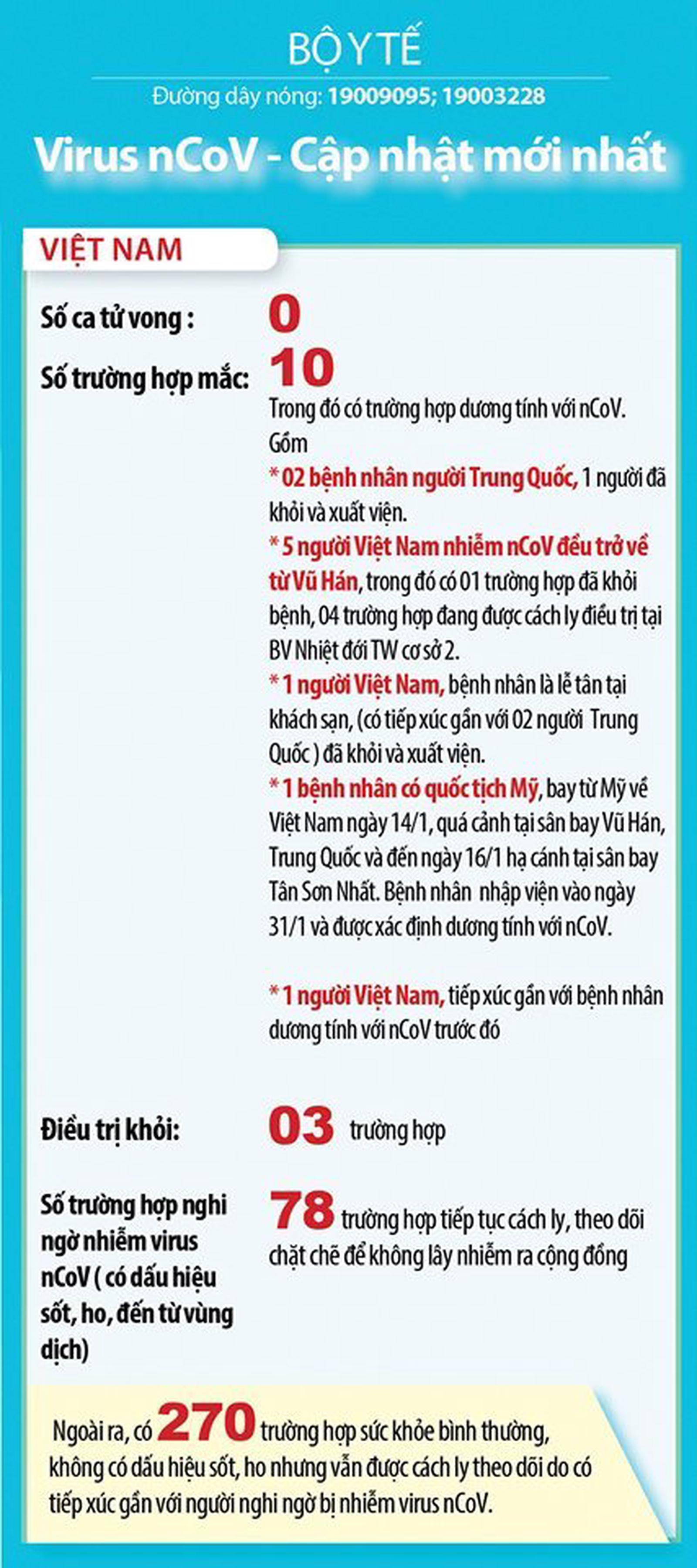 Tại Việt Nam, đã có 10 người mắc nCoV; trong đó có hai cha con người Trung Quốc (một người đã khỏi và xuất viện); 5 công dân Việt Nam đều trở về từ Vũ Hán, Trung Quốc (một người đã khỏi và xuất viện); một công dân Việt Nam là lễ tân có tiếp xúc gần với hai cha con người Trung Quốc (đã khỏi và xuất viện); một công dân Mỹ đến Việt Nam mà trước đó có quá cảnh tại Vũ Hán, Trung Quốc; một người tiếp xúc gần với bệnh nhân dương tính với nCoV trước đó.