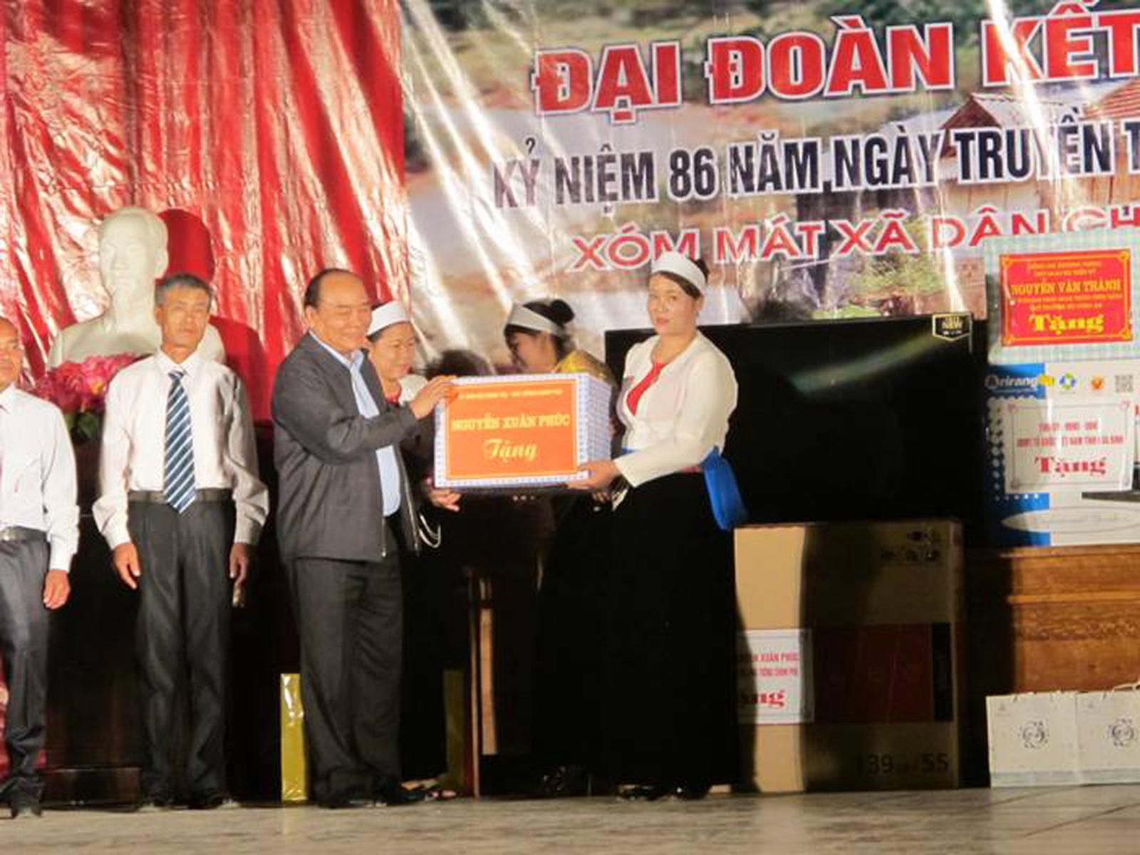 Thủ tướng Nguyễn Xuân Phúc trao quà cho nhân dân xóm Mát. Ảnh: HB