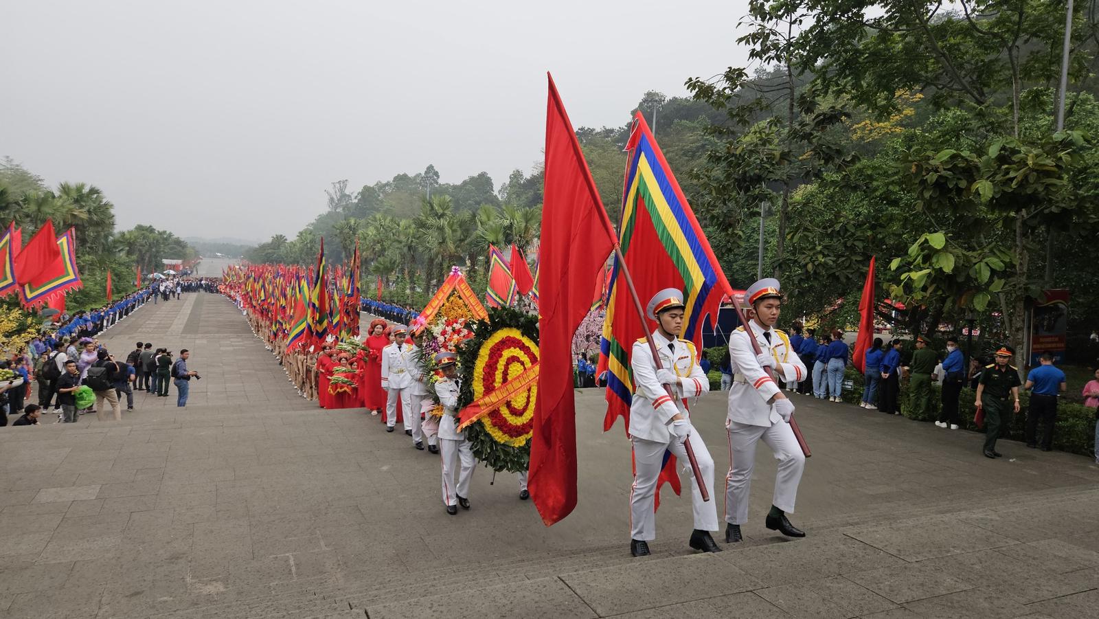 Đi đầu đoàn hành lễ là các chiến sĩ Quân đội nhân dân Việt Nam rước Quốc kỳ, cờ hội và vòng hoa mang dòng chữ "Đời đời nhớ ơn các vua Hùng đã có công dựng nước".