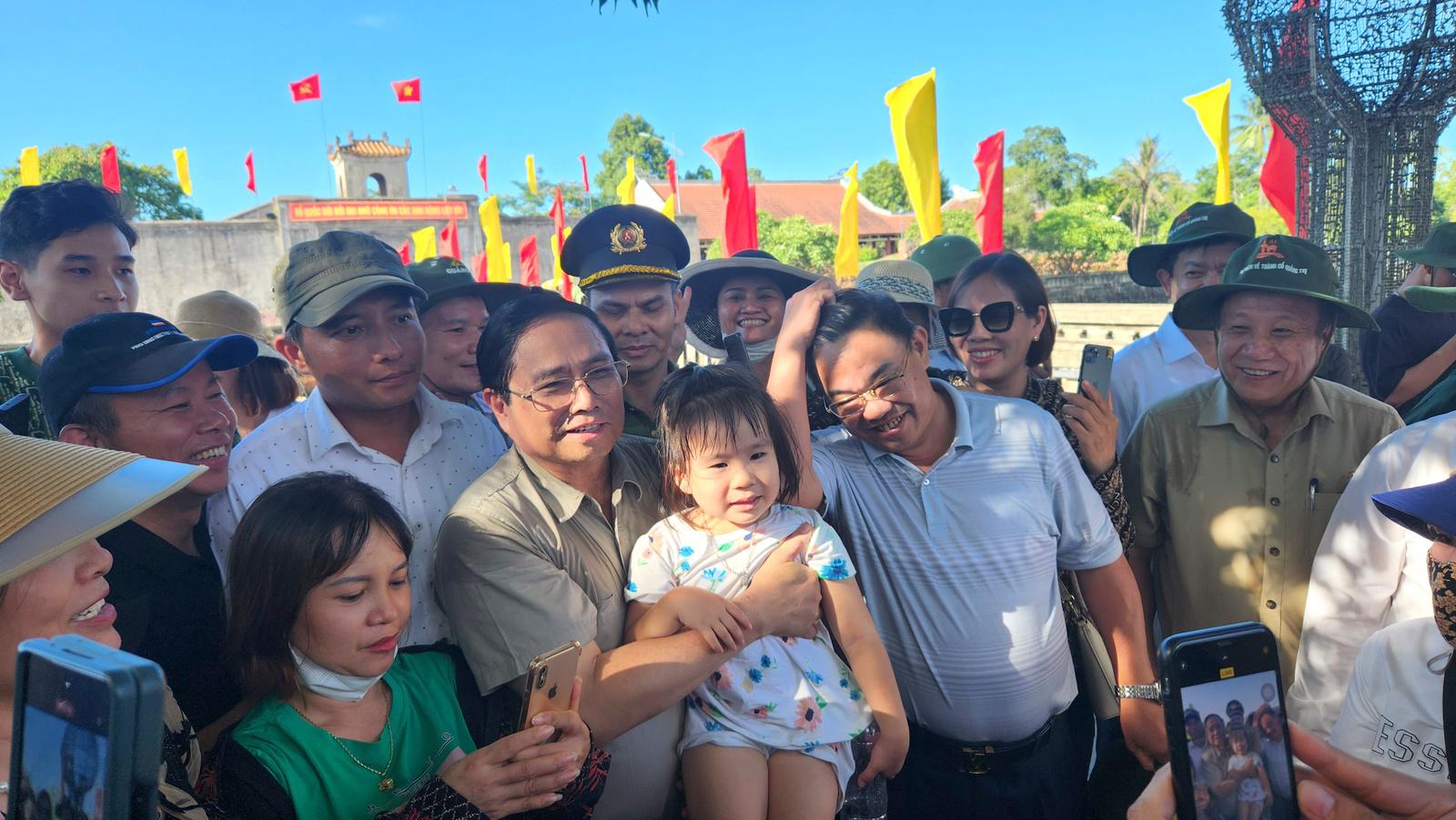 Thủ tướng Chính phủ Phạm Minh Chính trò chuyện với những người dân, du khách tại Quảng Trị. Ảnh: Minh Tân.